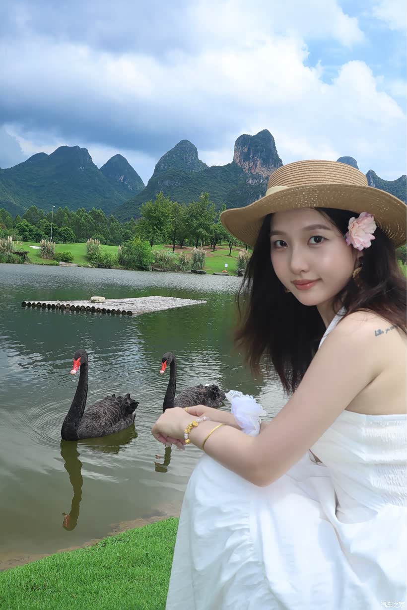 在桂海晴岚的时候,她蹲坐在那看黑天鹅,我喊她看我镜头,记录下了她和黑天鹅的合影。