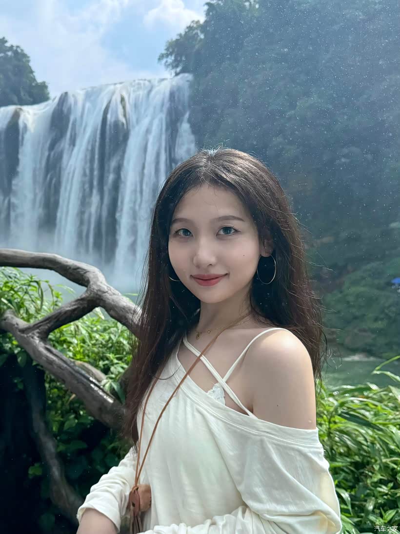 在黄果树大瀑布前,大瀑布的水珠在四周溅起,溅到她的身上,如同全身打上了高光一样,闪闪发光!