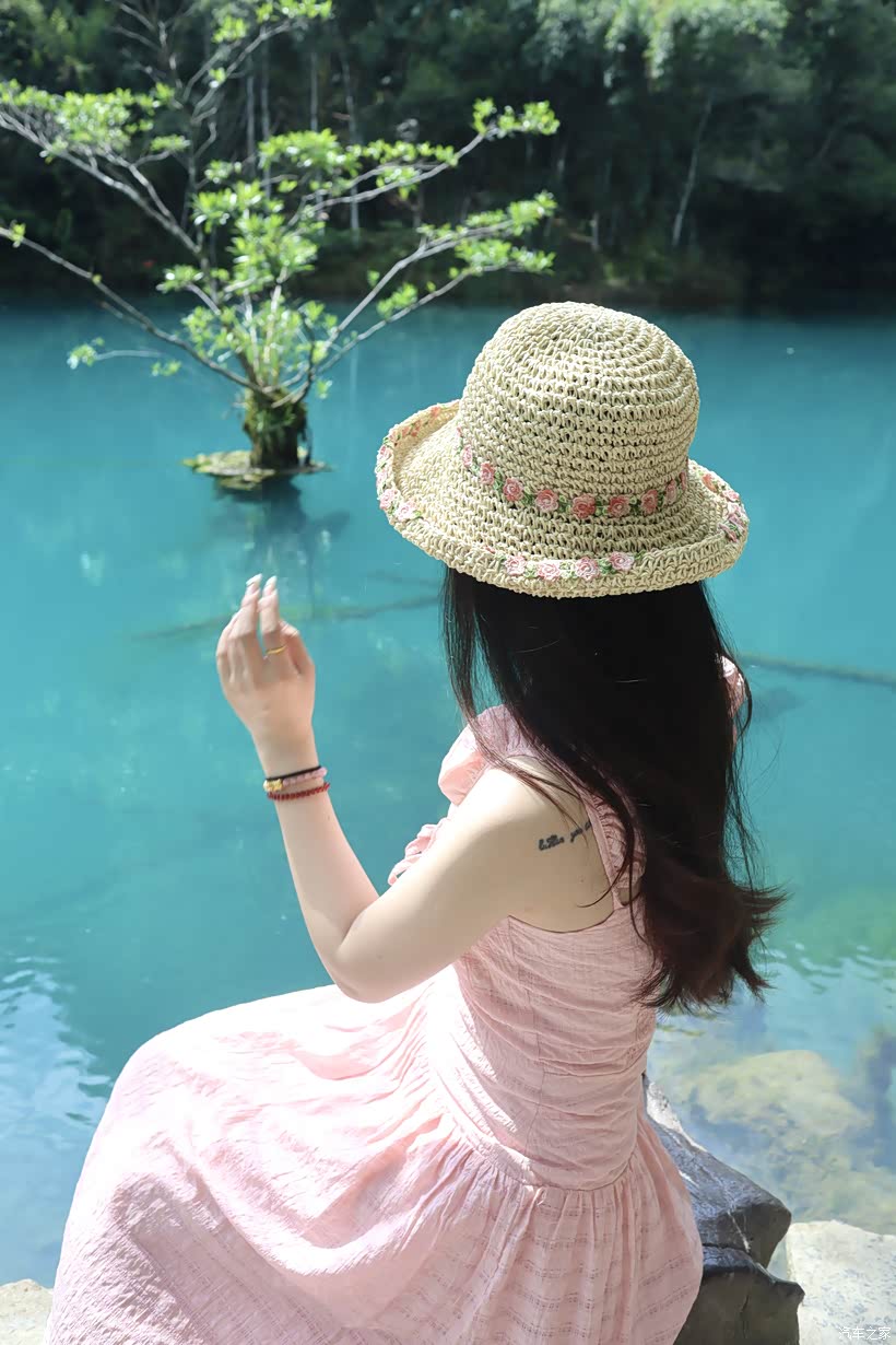 到了贵州荔波小七孔,她头发被微风轻轻吹起,穿着粉色连衣裙,背影和那碧绿的潭水一搭配,活脱脱就是大自然里的精灵。