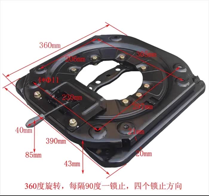 转换支架安装使用原车座椅固定螺丝,上面焊接8mm转盘固定螺丝,高度为1.5厘米(不能超过1.5厘米,掺和该尺寸,影响转盘旋转)。