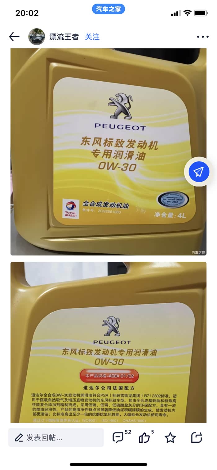 标致4008的原厂机油采用的是由道达尔代工的5W-30粘度的机油,如果在冬季使用或者经常短途用车,可用换用0W-30粘度的欧标C3、美标SP的机油代替。在此我为各位车友推荐美F的超金0W-30,嘉实D的极护0W-30,以上两款机油在线上的售价跟标致4S的原厂机油价格差不多,然而更长的换油周期,更好的发动机冷启动保护,