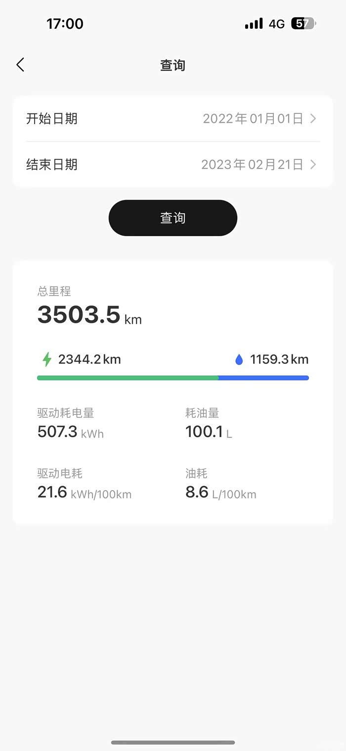 先介绍下的使用工况,工作日就是开车上下班,单程四公里,往返8公里多一些,目前还属于冬天,室外温度在0-10度左右吧,白天在室外停车,这个工况我觉得本身是不利于节能的,电池温度低、行驶里程短。以前开油车的时候,开到家了发动机水温都不上80度。平时我都是用纯电模式,正常开驱动电耗是在20-21左右,开车比较随性吧,没有考虑节能这些事。然后出远门、自驾游的时候,我就会选择混动模式,这种模式下低速用电,高速烧油,油箱常备个一两百公里的燃油续航,基本上走到哪里都不怕了,如果目的地有充电条件且不赶时间的话还会小充一会电,这样的使用环境只是需要担心会不会燃油过期。从实际的体验来说,增程式的能耗表现还是很不错的,目前跑了3503.5km,其中燃油驱动行驶了1159.3km,只用了不到三分之一的工况,其他时候都是用电,电耗21.6,油耗8.6,还是非常能够接受的,毕竟我的油耗可是全高速工况。