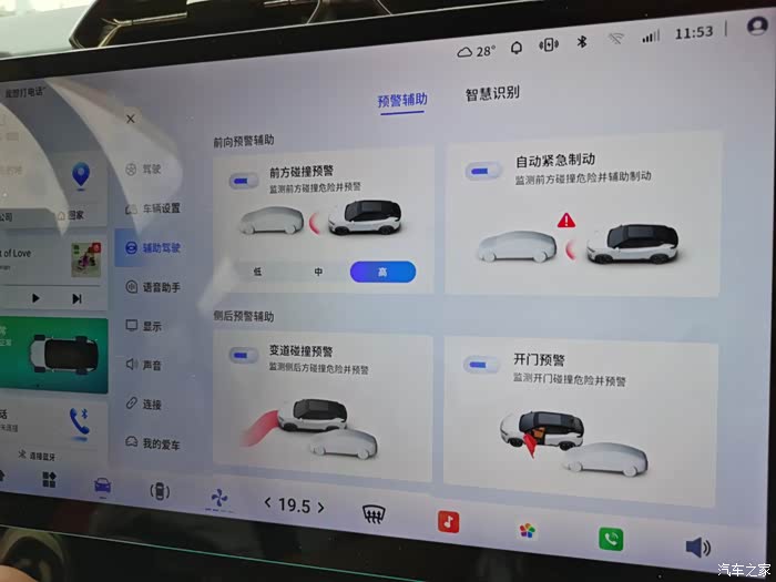 接下来就是它的主动安全配置,前方碰撞预警,自动紧急制动,变道碰撞预警,还有开门预警,这些配置在车机的辅助驾驶里面就可以看到,这些功能可以帮助驾驶员提前预判风险,有效的提升行车安全性,尤其是开门预警这个功能,它通过雷达和摄像头监测后方车辆状况,当后方有车辆时,系统就会触发语言提示,这个功能无论是对驾驶员还是乘坐者都有很大的帮助,关键时候能够避免碰撞事故的发生。