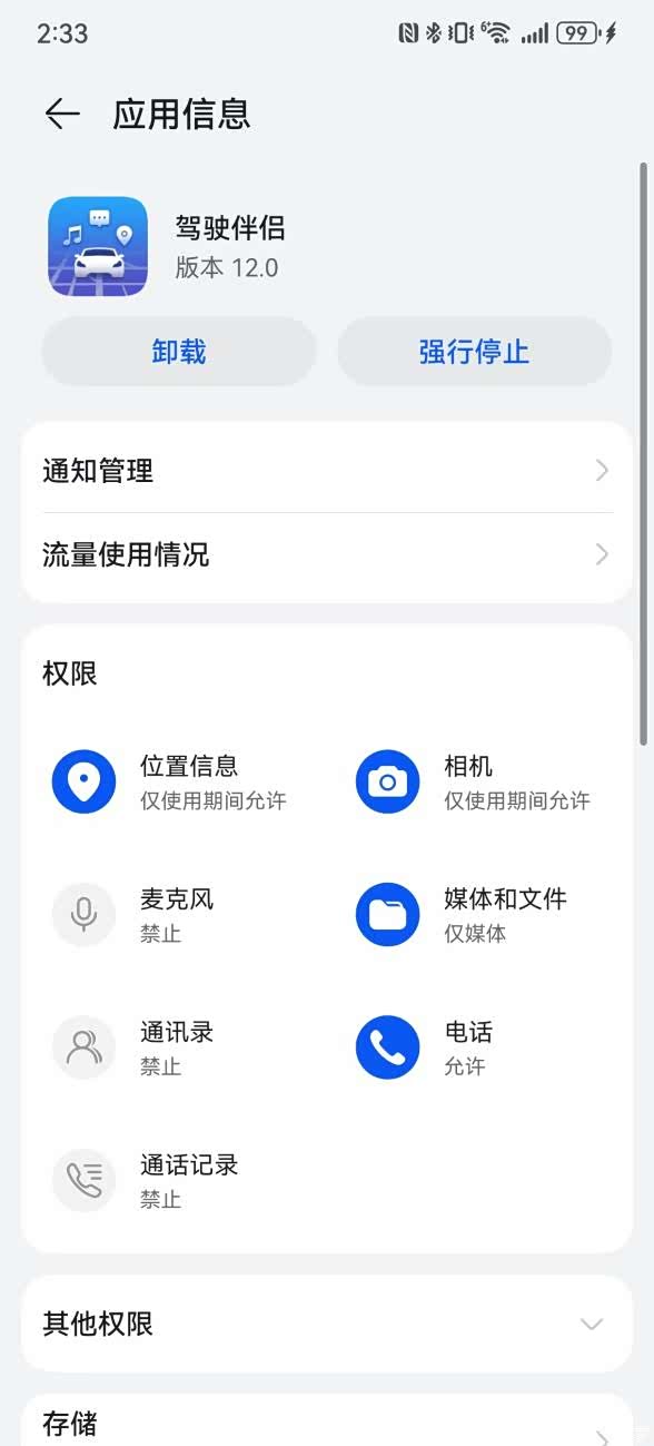 3、在手机上把驾驶伴侣APP的存储权限等开启,避免后续连接会断联;