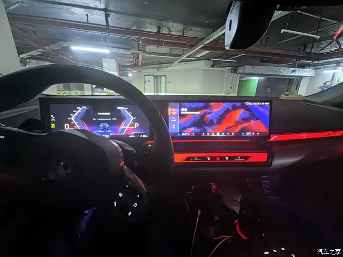 这点确实有惊喜,坦白讲,以往会选择新势力车型,大多是因为被科技感内饰所吸引,对比前代的小连屏,这次更新换代配合酷炫的水晶灯带,第一次试驾即已入迷,相比于某些“毛坯式”内饰,简直是对比感强烈。
