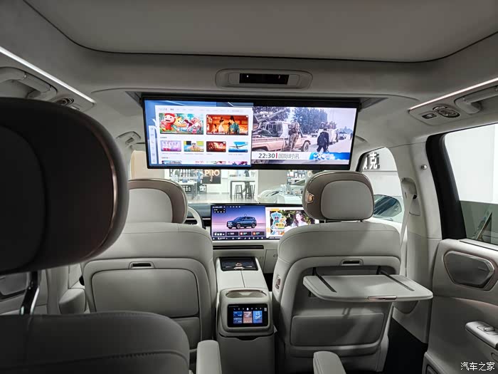 1、30英寸6K双巨幕:前排天际屏与后排吸顶屏支持分屏、投屏及多任务处理,副驾可将导航信息“滑移”至主驾屏,后排可独立接入视频会议。