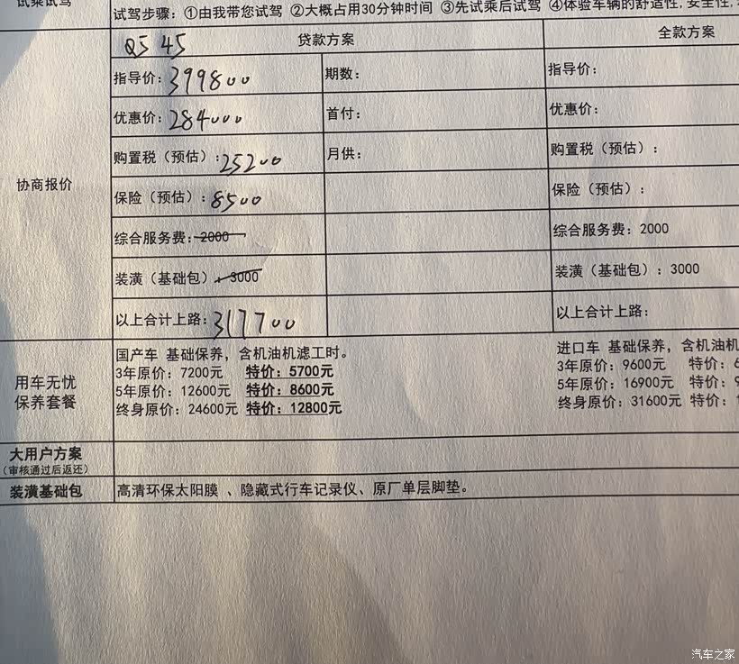 ps:下面有4S给的最终报价单,送3次保养以及全车太阳膜,最终价格大概是313700左右,请问这个价格高吗?