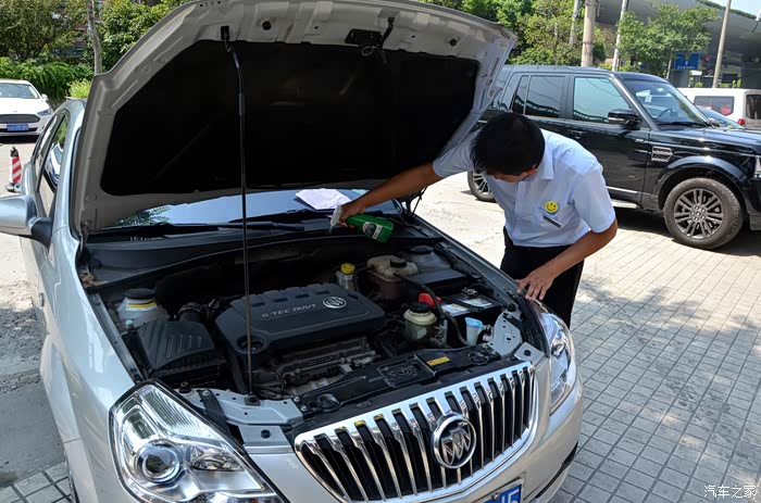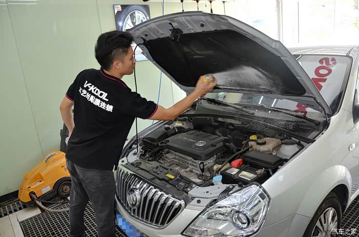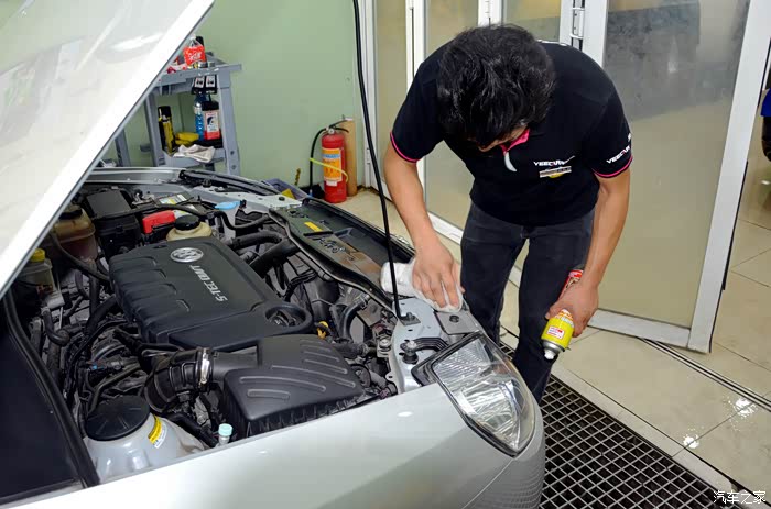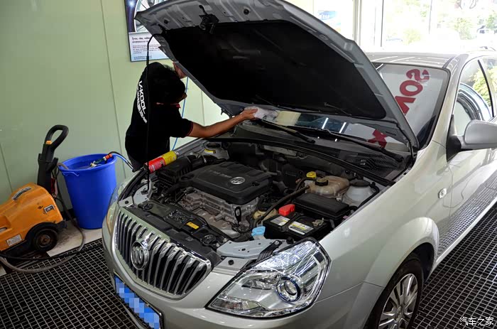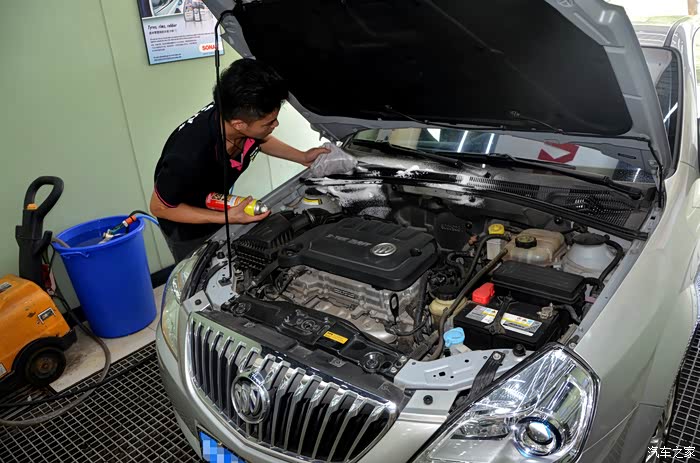 打开发动机舱,小哥先用泡沫清洁剂为我清洁发动机舱