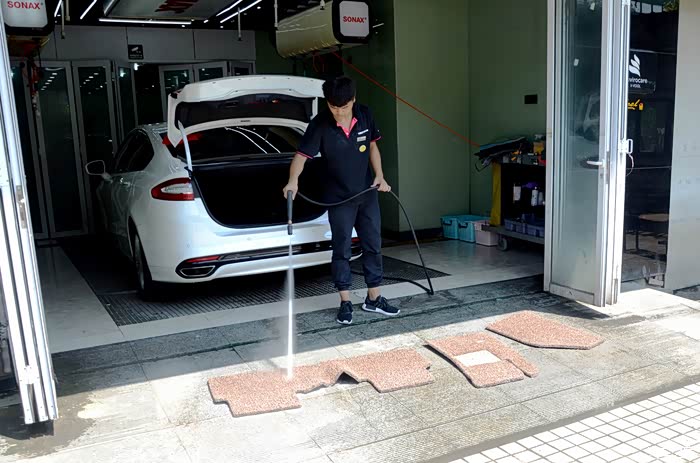 另一位小哥则趁机取出车内的丝圈脚垫,用中水进行冲洗清理
