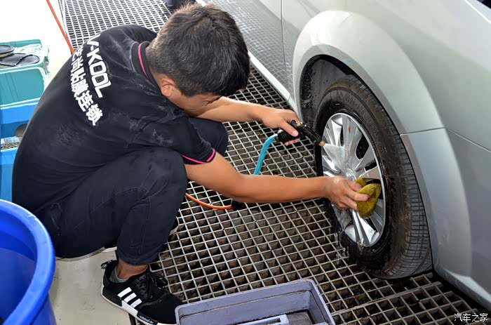 清洗完脚垫的小哥,拿着水枪过来帮心清洗轮胎和轮毂,洗的那叫一个耐心,一个细心!