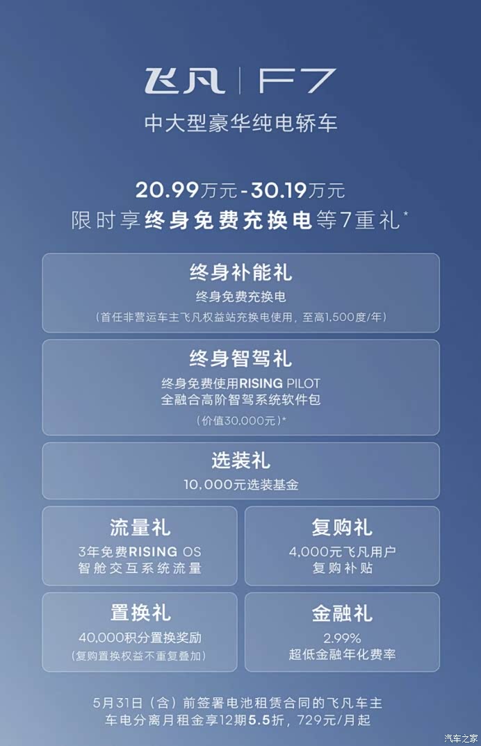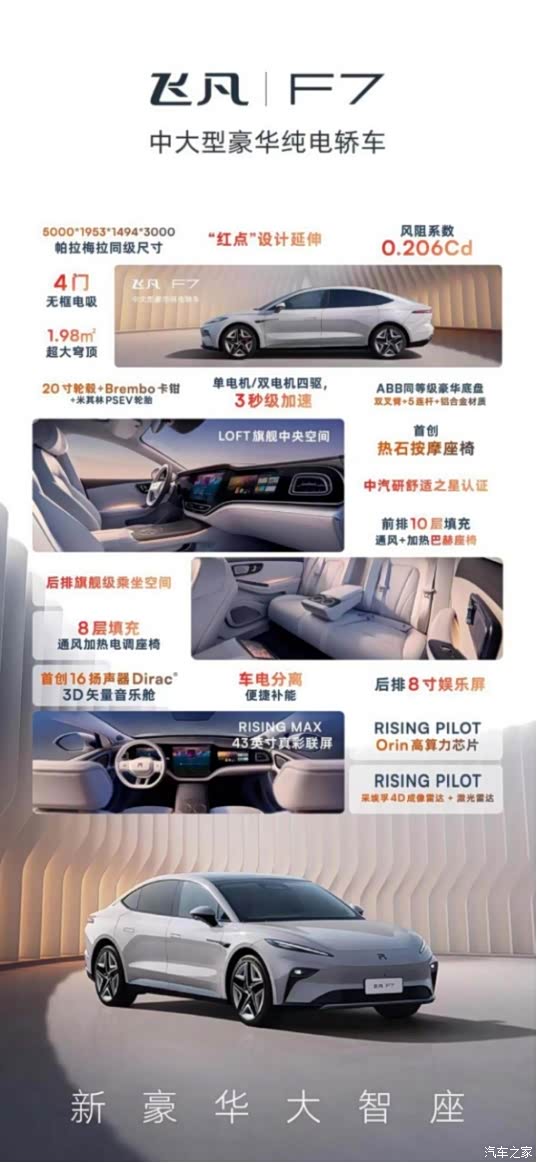 在这个周一的夜晚,看到20.99万起的定价,网友直接把飞凡的服务器都给挤炸了。毕竟谁能想到这样的价格可以入手的是一辆百万豪车配置的中大型豪华纯电轿车!延续工业界的“奥斯卡”红点奖设计,豪华超跑势能美学,标杆级风阻系数勾勒出极具艺术性的车身线条。飞凡F7的巴赫座椅,获得中汽研“舒适之星”历史最高分的人体工学座椅,为国人体格特征定制,即使是后排也同样兼顾,496mm同级最长坐垫,通风加热功能的同时还可电动调节角度,享受包裹感带来的极度舒适。将舒适升维,直接重新定义豪华,就是飞凡F7的新豪华大智做。更有行业首创双向双区独立影院场景,15.05英寸超清中控屏,百万级后排8英寸娱乐控制屏,构建豪华行政座驾体验!