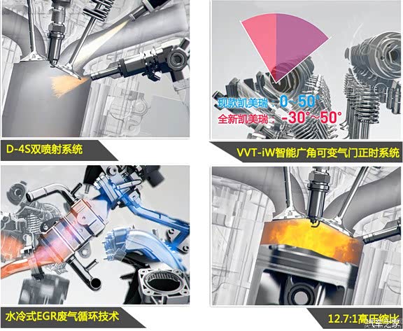 2015全新凯美瑞(七代中期改款)使用的是6AR-FSE发动机,这款发动机采用了VVT-iW智能广角可变气门正时系统,实现阿特金森循环和奥托循环,从而使发动机达到12.7:1的高压缩比,配合着D-4S双喷射系统、水冷EGR废气再循环技术使得油耗下降,功率提升。6AR-FSE采用了的是缸径为86mm×行程为86mm横切面为正方形的缸体,这种短行程发动机注重高速性能,功率大。但采用了D-4S双喷射系统,在不同工况下采用不同的喷油模式,提升燃油效率,减少碳氢化合物和氮氧化合物排放;同时大大减少积碳的形成。该款发动机最大功率为123kW,最大转矩199N·m,功率完全可以媲美2.5自然吸气发动机。而且官方给出3年或6万公里免费基础保养的服务,可以节约一定的用车成本。全新的2.0L直喷发动机相比旧款2.0L发动机,带来直接的效果是最大功率由原来108kW提升至123kW提升14%,最大扭矩由190Nm提升至199Nm提升5%。百公里综合油耗由原来的8.4L降至7L油耗下降20%。全新的2.0L直喷发动机动力上的提升还是相当明显。VVT-iW智能广角可变气门正时系统1996年丰田研制出第一代D-4发动机燃烧系统,结合SCV(涡流控制阀)和EGR(废气再循环技术)使性能大大提升;1999年丰田又开发了第二代D-4发动机燃烧系统采用了狭缝喷油嘴喷油器和壳状的燃烧室,分层稀燃最佳工作范围加大,最稀空燃比可达50。第三代D-4S双喷射系统配备了两种喷射方式,缸内直喷和歧管喷射。发动机冷启动时,采用进气歧管喷射;低中负荷时,采用混合喷射,提升扭矩,降低油耗;高负荷时,采用缸内直喷,提升功率。VVT-i可变气门正时系统是丰田看家本领之一的技术。VVT-iW相对于VVT-i,在原来的机构上,多增加一组活动组件,增加气门角度可调节的范围,从原来的50°增到80°,可更加灵活控制气门启闭时间,确保发动机在任何工况下都实现最佳的空燃比。VVT-iW智能广角可变气门正时系统通过特殊锁止装置,使发动机在阿特金森循环和奥托循环两种工作模式下工作。这就是“W”,“W”在日语中发音和“Double”相同。低工况时气门迟闭,排出部分新鲜空气,令压缩行程小于膨胀行程,实现热效率高的阿特金森循环,达到省油的效果;高工况时气门提前开启,进排气效率更高,取得奥拓循环低扭强劲的优点。两种循环互补优缺点,一句话总结:少吃多干。