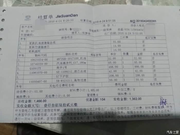 到达4S以后,正好是他们上班的时间,排到了第一的位置,心中那个高兴呀……之前咨询售后二保的报价是600元左右,可是到了之后给了一个报价1335元,我晕,整整贵了1倍,经过咨询,机油996元(两桶4L的美孚一号5W-30全合成机油),空滤42元,机滤32元,汽油清洗剂95元,机油清洗剂128元,工时费42元,机油用的是美孚一号绿装版5W-30的全合成机油,没有1L装,只能一次买两桶,剩余的下次使用,我心中纳闷,就提出了什么时候有机油清洗剂这一项的疑问,结果售后一大套的说辞,最后坚决砍掉,后来给的报价是1207元(其实算下来小保养也就是650元左右,两次保养用3桶机油足矣)。