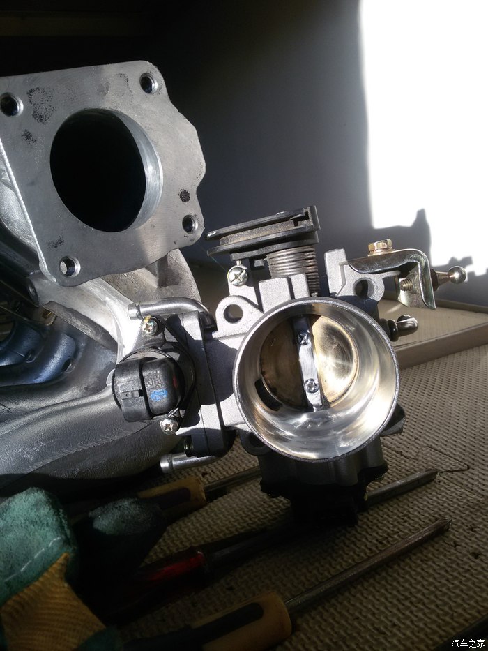 接下来就是发动机进气小小改动。改4G18进气软管加进气共鸣箱,换大容量蓄电池。还有节气门加大 ,抛光。进气歧管抛光。大油门进气声音挺带劲的。