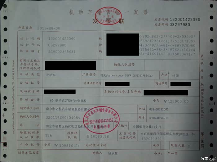 关于提车时候的价格,我只能说一分钱没多花,一分钱也没有少花。该有的都有了,该没有的都没有,赠品就那些也没有广东朋友说的自行车。新车肯定不会让一分钱,选择白橙色颜色加价也加了,另外保险也是在4S店买的。发票价格是官方指导价12.5 颜色选配2900。总共12.79W,保险的基数也是按这个算的。