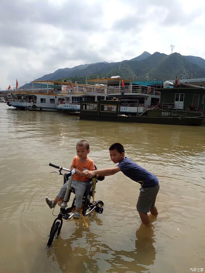 下车走到江边渡口,见到冰凉的河水,先玩起水来