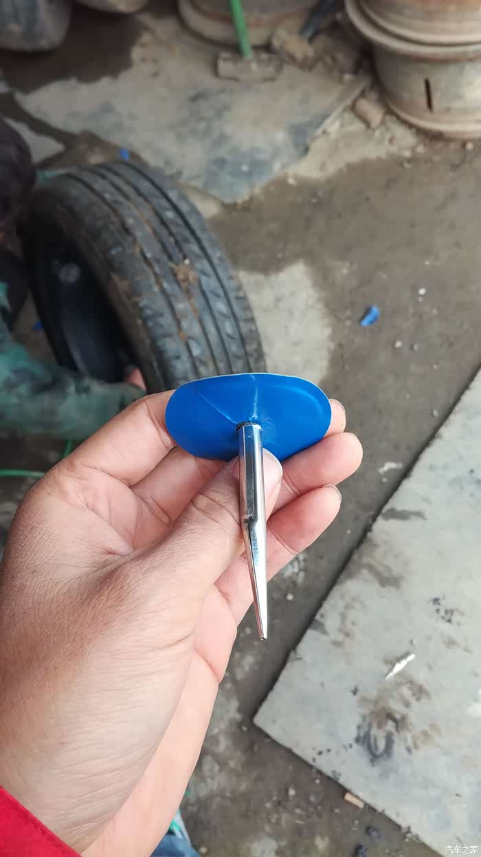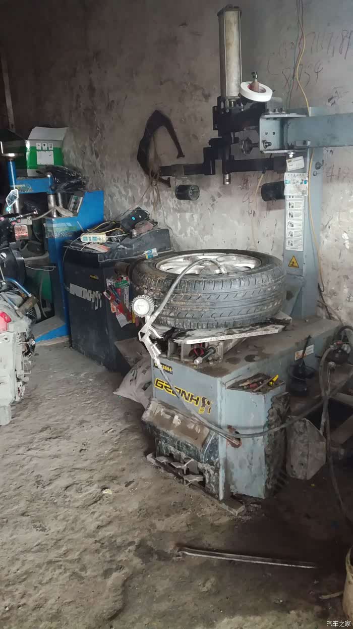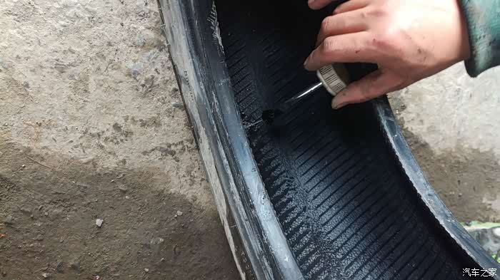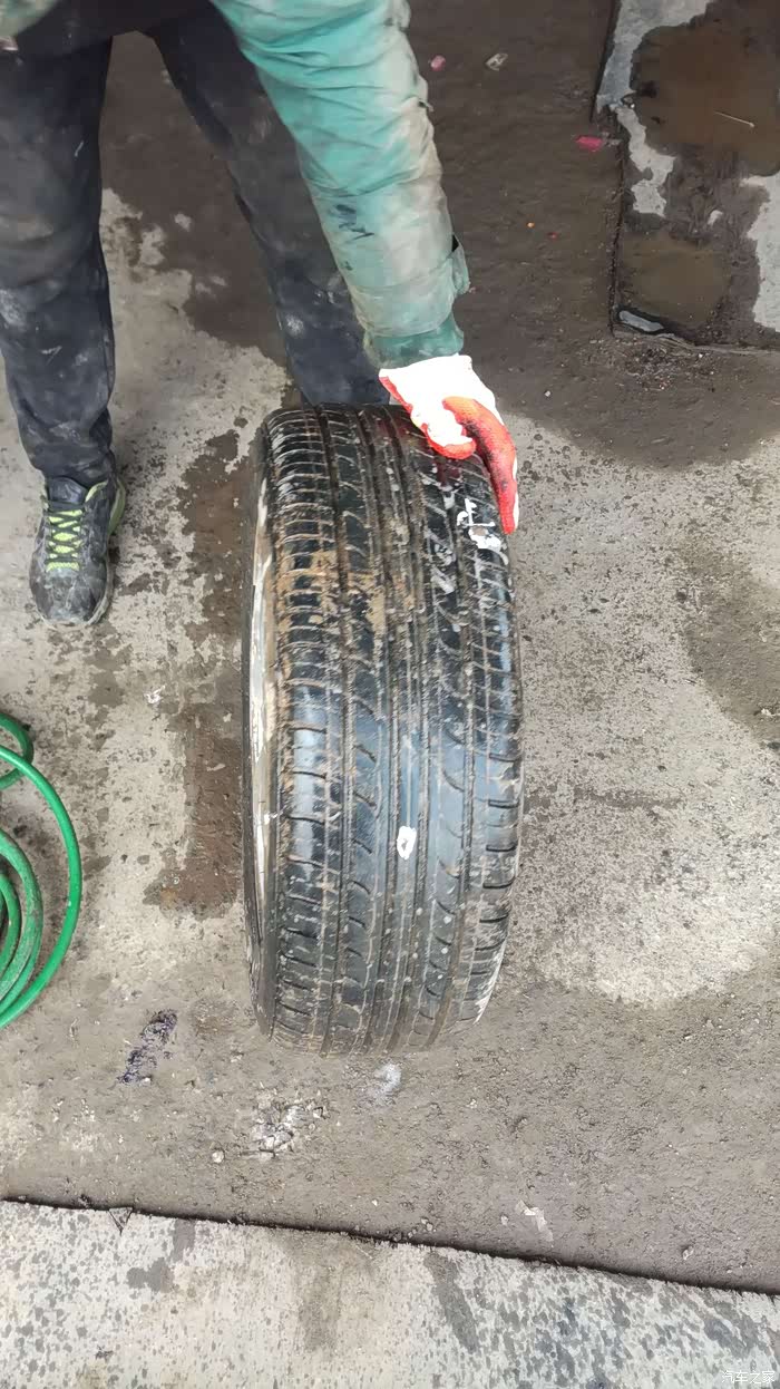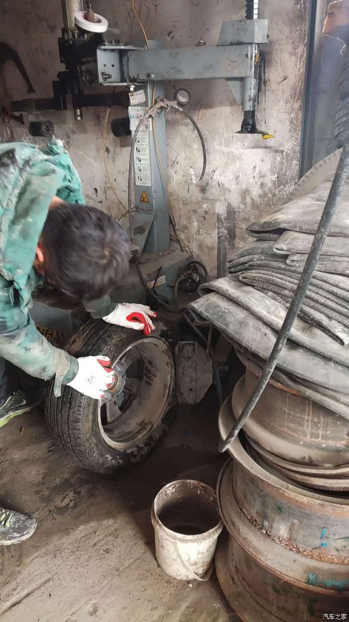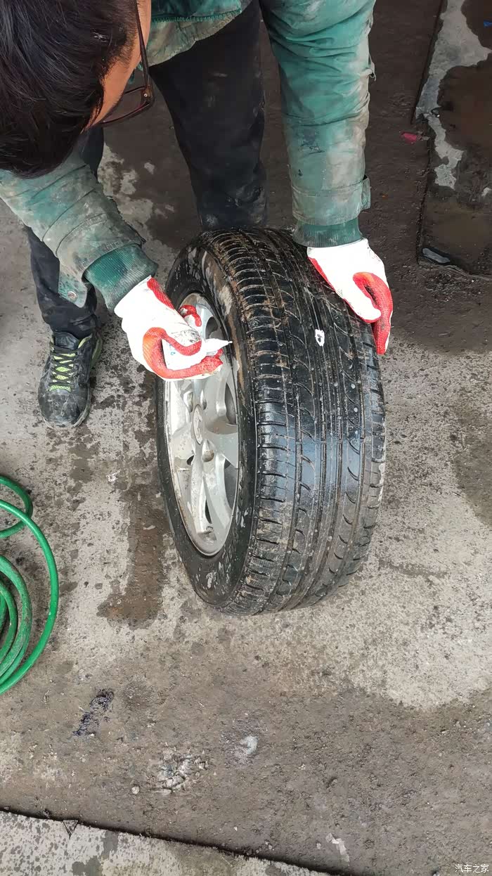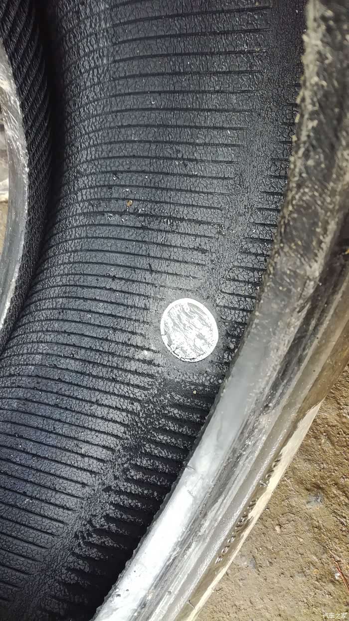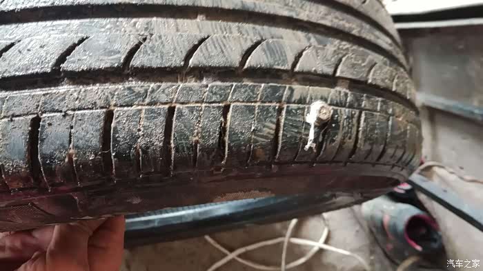 年初七出门,回家天色已晚,黑灯瞎火的看不到地面的东西,勉强开到家,停好车吃完饭就睡了,早上起来开车时没有检查车子直接打火动车,走了几米,感觉声音有些不正常,车车行驶的声音不是平时平稳好听的嗡嗡声,而是感觉车轮有异响!!!于是把车停下,下车一看:轮胎不知怎么就没气了,急着赶路,再加上春节期间很多店也没开门,也没时间补了,换了备胎直接走人。备胎一装就是三个多月,这不抽时间补胎了。