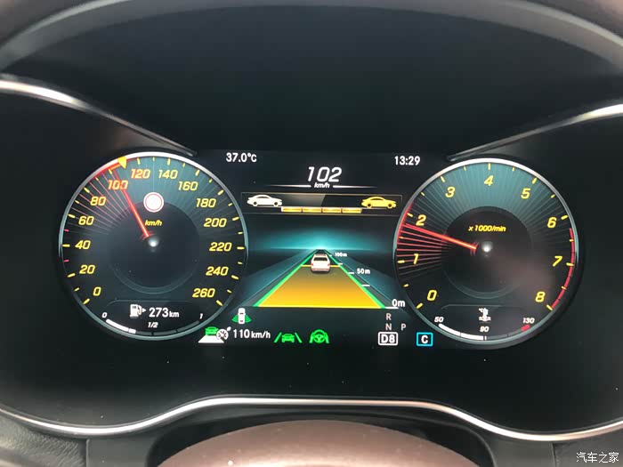 奔驰的原厂HUD抬头显示的显示内容非常丰富,可以把重要的信息,比如:导航、方向、时速、胎压、多媒体、智能驾驶辅助系统等关于行车的相关重要信息投影到前挡玻璃屏上,让驾驶者无需低头就可以了解当前重要的信息。