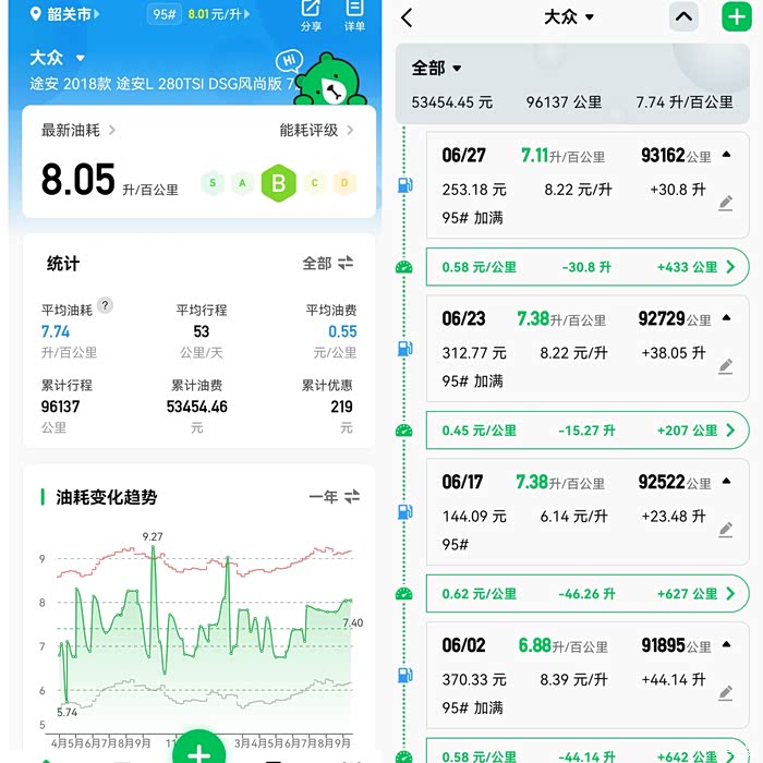 作为家用车,用车成本也是我考虑的一部分,途安L搭配的1.4t涡轮增压发动机和7速干式双离合,动力强劲,换档逻辑非常快,燃油经济性也非常好,我的爱车跑了接近十万公里,综合油耗在7.8/百公里,远低于市场上同级别的很多车型,为我节省了不少的用车成本。