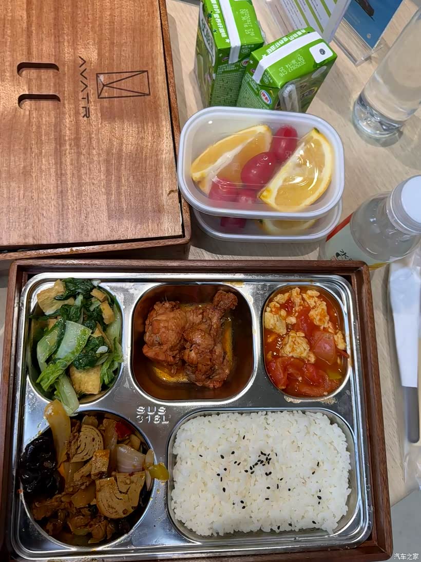 线下提前和售后进行了预约,抽了个工作日人不是也不多的时候去店里,参加了阿维塔的悦冬行动,一到店工作人员见我们到了就帮我们开车门,因为我停车技术不是特别好,小哥还帮我停了车并很贴心地提供了瓶装温水,车辆交接好之后引导我们去一旁的休息室等候。首先这个冬季保养是完全免费的,对全车进行免费检查,电池啊,轮胎啊,还有刹车都检查得超级仔细。因为马上冷空气来袭,还贴心地给免费加了防冻液和玻璃水。师傅还特意交代冬季胎压要调得稍微高一点2.8bar左右。因为正好赶上饭点,售后小哥还主动邀请在店里享用午饭,之前听其他车友说阿维塔的餐食不错,这次彻底感受到了,四菜一汤,还有餐后水果。果汁酸奶一应俱全。