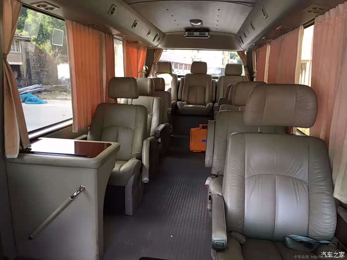 此车型是宇通现今高端7米车T7系列车的前身——威斯达V—STAR系列车型,这车出厂时间是2011年,到现在仅跑了六万四千公里,足见跑的之少,还不如很多私家车的里程数。先说一下这车的大至概况。车身尺度7045X2065X2650,整备质量4800千克,最大总质量7300千克。车身比较小巧灵活,自由穿行于乡间小道。车内空间尤其是头上空间很宽阔,身高1.9米以下的完全不必屈身。车子是大商务座的座椅,全车连前排驾驶座和副座仅布置了12个座位,7米中巴车12个座位足见空间之大,车上带冰箱(不知道是好是坏也没开启过)写字台,储物箱等,座位之间的间距只要你不是1.9米的大高个都没问题,座椅几乎可以放平状态,除了最后一排三个座位。车漆相较于一般的中巴车成色要好很多,反光镜也是带镀铬的。方向盘大小适中,没有六米老乡中巴大,方向有点沉,高速行驶时有一点自由度,要不断的微打方向以修正。刹车是液压的,刹车不是很好,感觉很软,要多踩几脚,制动效果没法和六米城乡中巴的气刹相比,手刹也是普通机械拉索式的,郊果也不是很好,略带坡度的还是熄火放一档比较稳妥。发动机是朝柴的NGD3.0四缸柴油机国三排放,排量3.0升,最大功率125KW于3800转,最大扭矩362牛米于1600-2200转。发动机噪音比较小,怠速时震动也比较小,比六米城乡中巴的玉柴4FA130要好太多,这个好评。变速器是5档手动的,型号5MF,不知道是哪个品牌的,1档入档有点难挂,倒档有时也有点难挂,其他档都还好。平路2档起步,坡起用1档,2000转升档的话略有点拖的样子,如果3000转升档,动力比较的充沛,后桥速比5.28,在5档时1750转60公里 2000转70公里 2250转80公里,轮胎是双钱的7R16中巴专用轮胎。由于前天全程在国道县道乡道上开,没上高速,所以最快只跑80,80公里行驶车身稳定性不错,比六米城乡中巴要好,80公里车速行驶时的机噪和胎噪都远比6米城乡中巴要好的多,车的避震也不错,过起伏路面不怎么颠,如果路况较差的速度放慢一点都能平稳的通过,这点好评,而相同的路况相同的速度6米城乡中巴会颠出屎来。和六米城乡中巴一样,副驾右侧没有右下可视的玻璃,再加上右反光镜的视野视角不是很广,若是右转时贴近右侧的电瓶车或行人一定要注意,这一点差评,有一定安全隐患。前天大概来回开了一百余公里,也大概领略了宇通仿考车的风采,总的来说给我的驾感还是不错的,至少比宇通六米的宽体城乡中巴ZK6608系列要强太多。