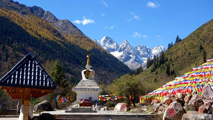 前往达古冰川时,途经雅克夏国家森林公园,喜逢今年第一次雪花儿飘过!尽管是途经,尽管是稀疏,但落下立即融化的小小雪花,留给的是沁入心骨冰爽。返程再经雅克夏时,一夜霜冻,眼前彩林遍布,远处雪峰重逢,山林就这样无需理由的一夜五彩变身。