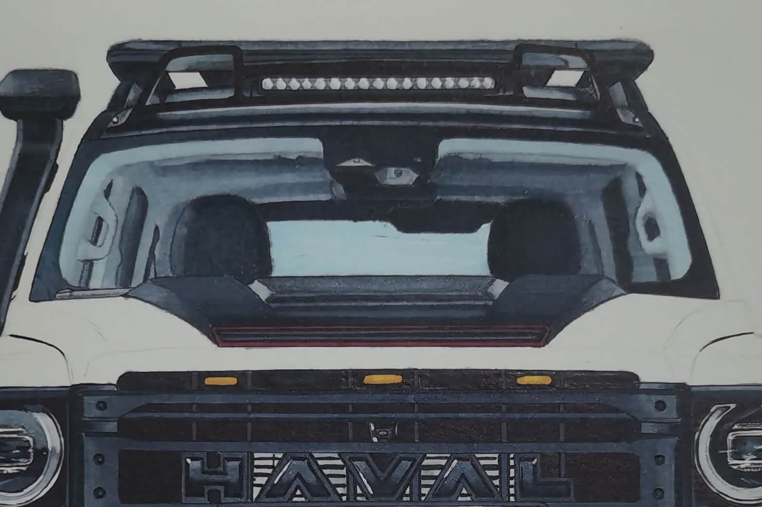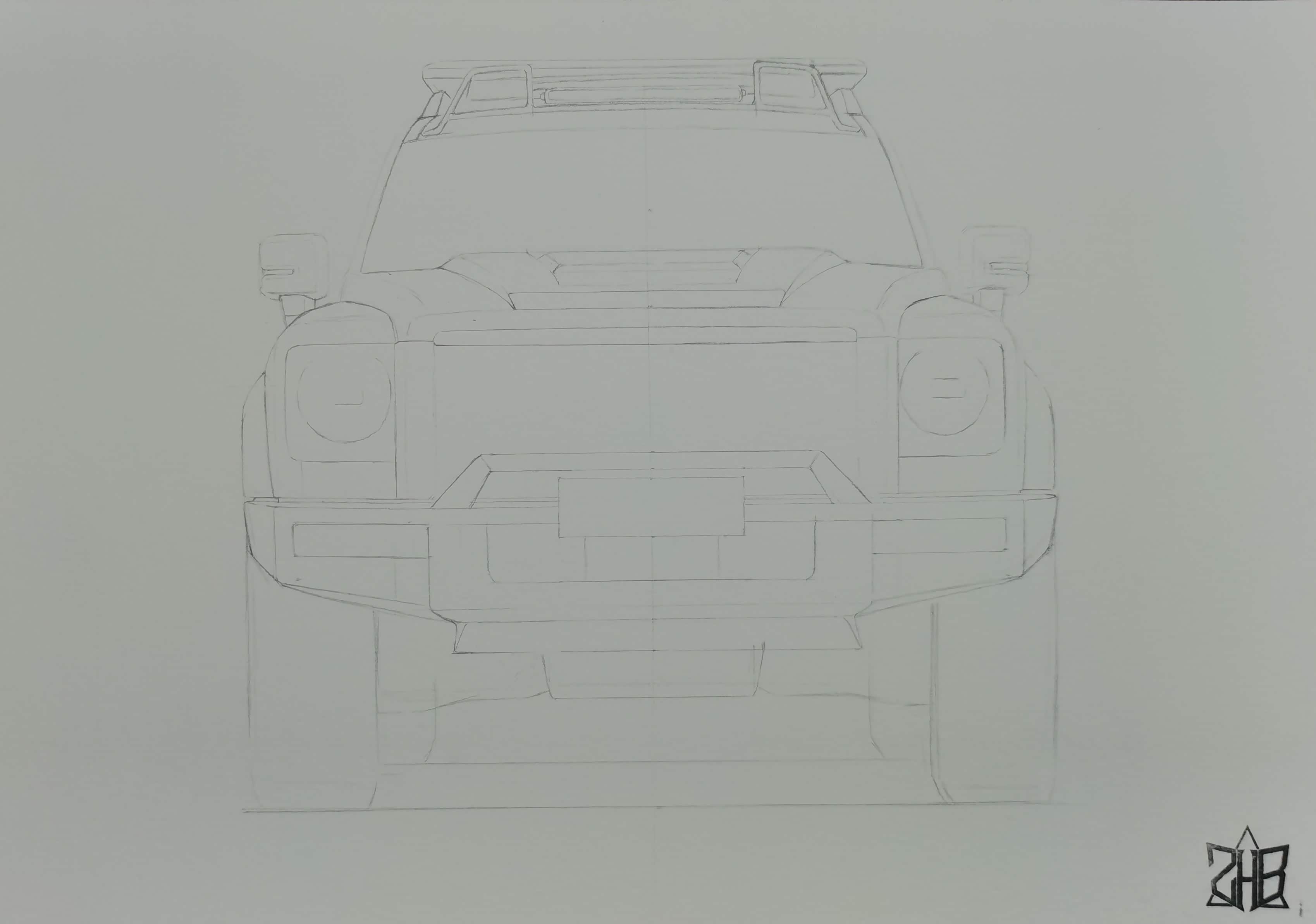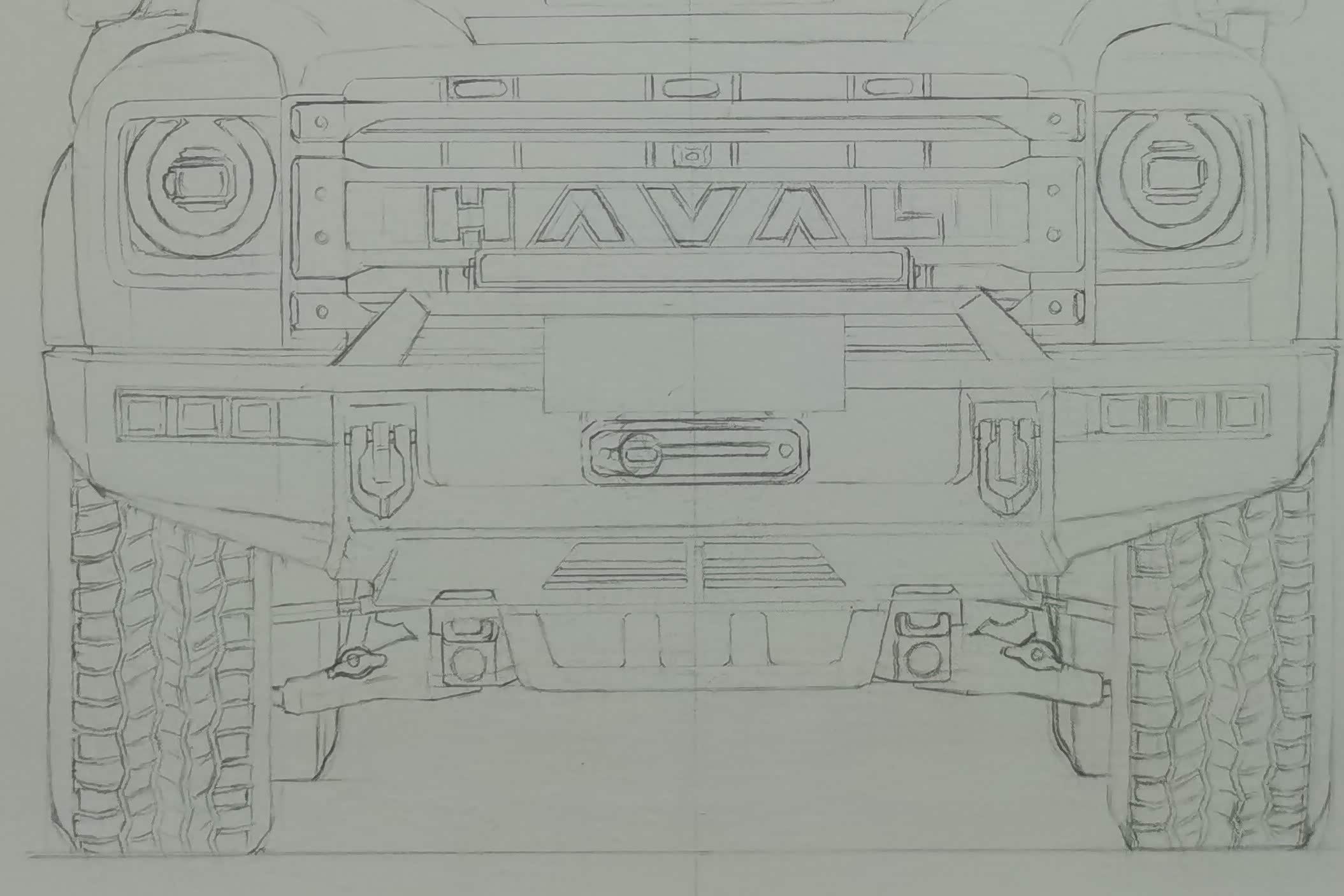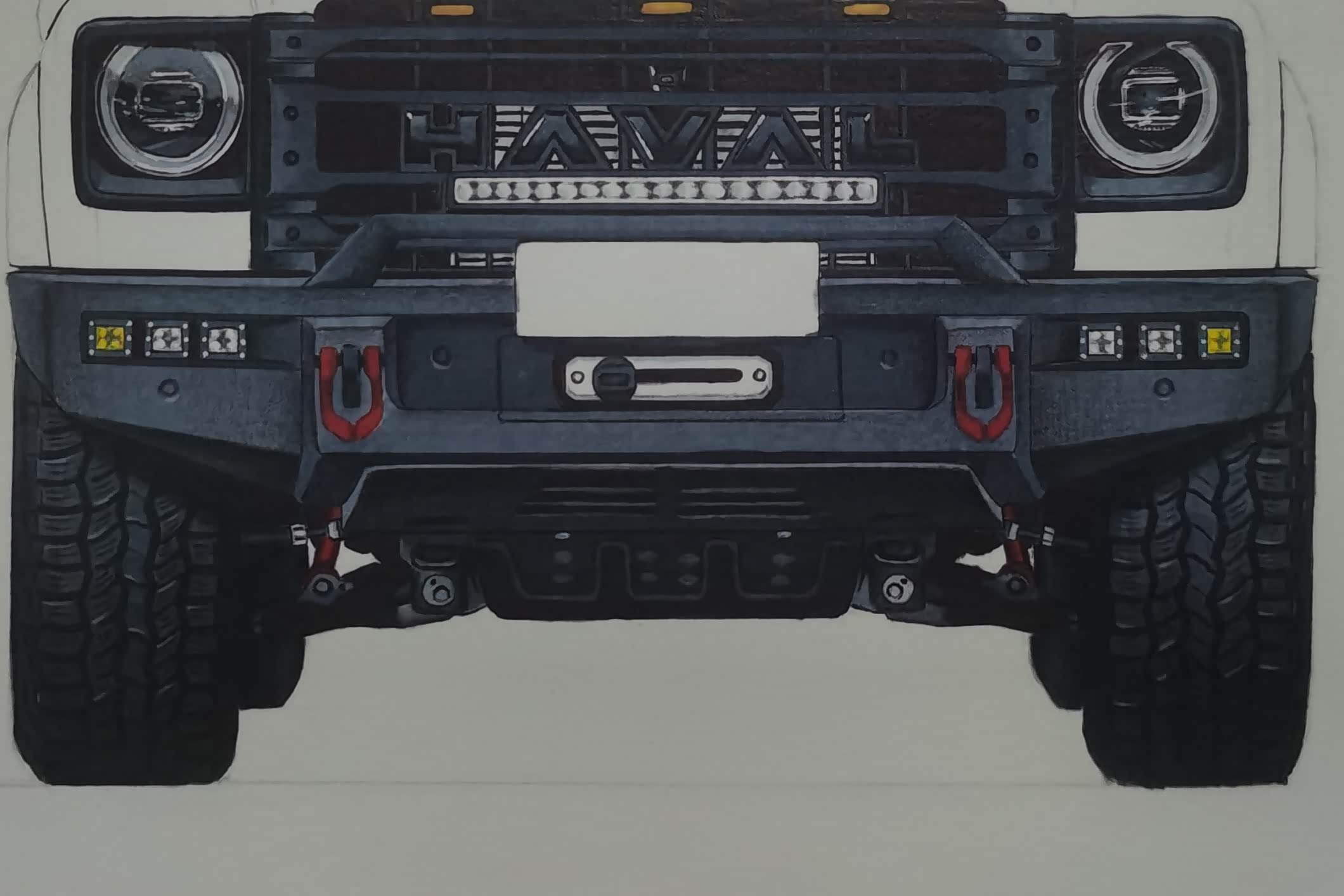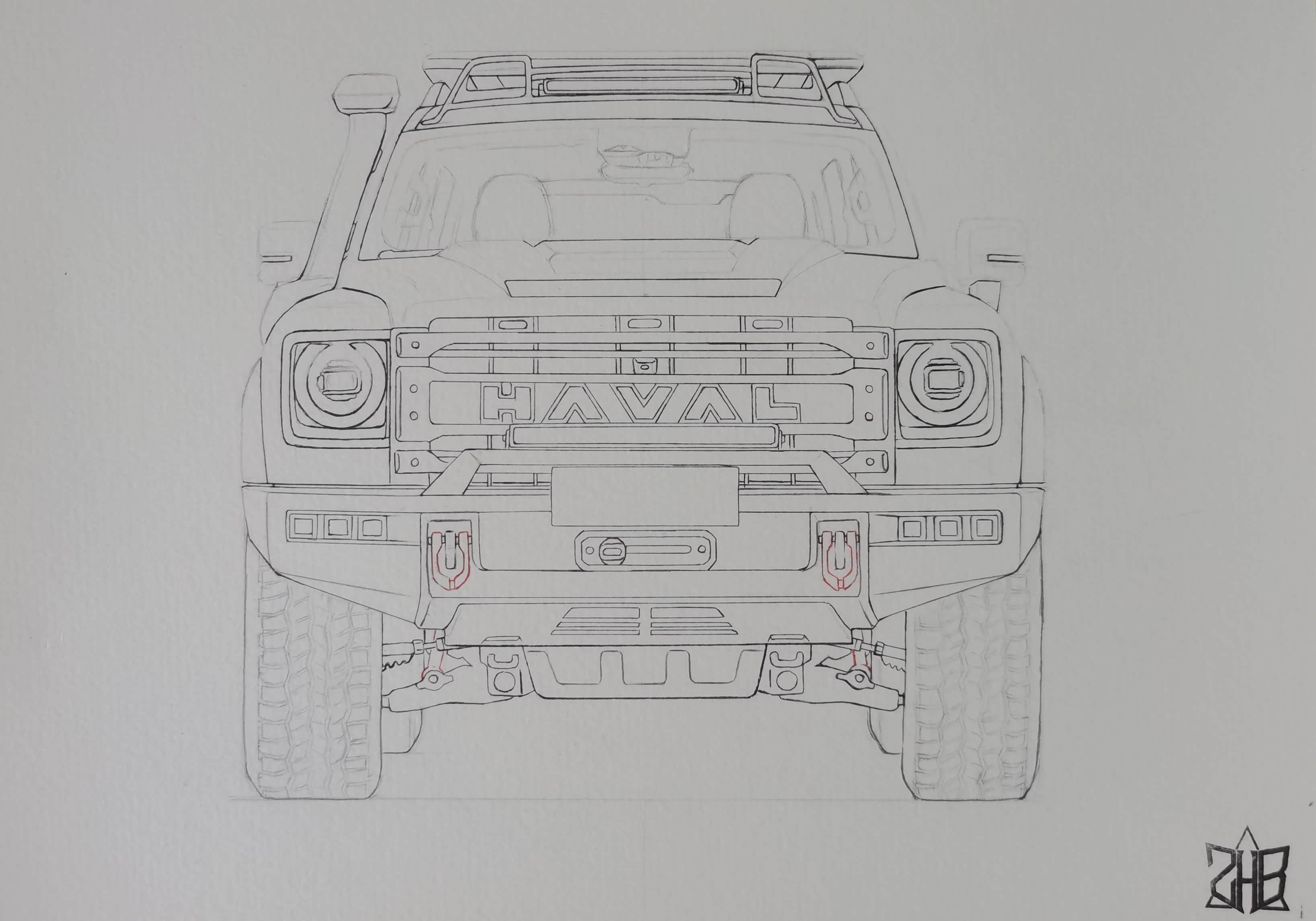 素车采用25年新上的版本,2025款2.0T汽油四驱勇士版,售价格23.99万,相比于汽油顶配车型勇士版许多配置都是标配。此次改装为车辆正面,确定好素车构图,画出车辆大致的草稿图,同时把需要改装的地方先预留出来;初步形体草稿完成后,开始加深并细化车身形体,进一步确定好车身、中网大小等形体,使得整台车初步成形。