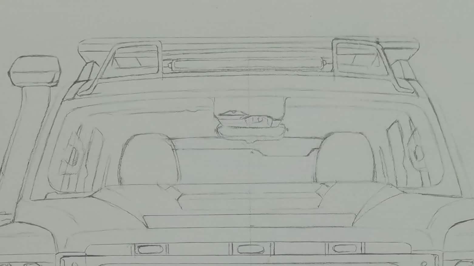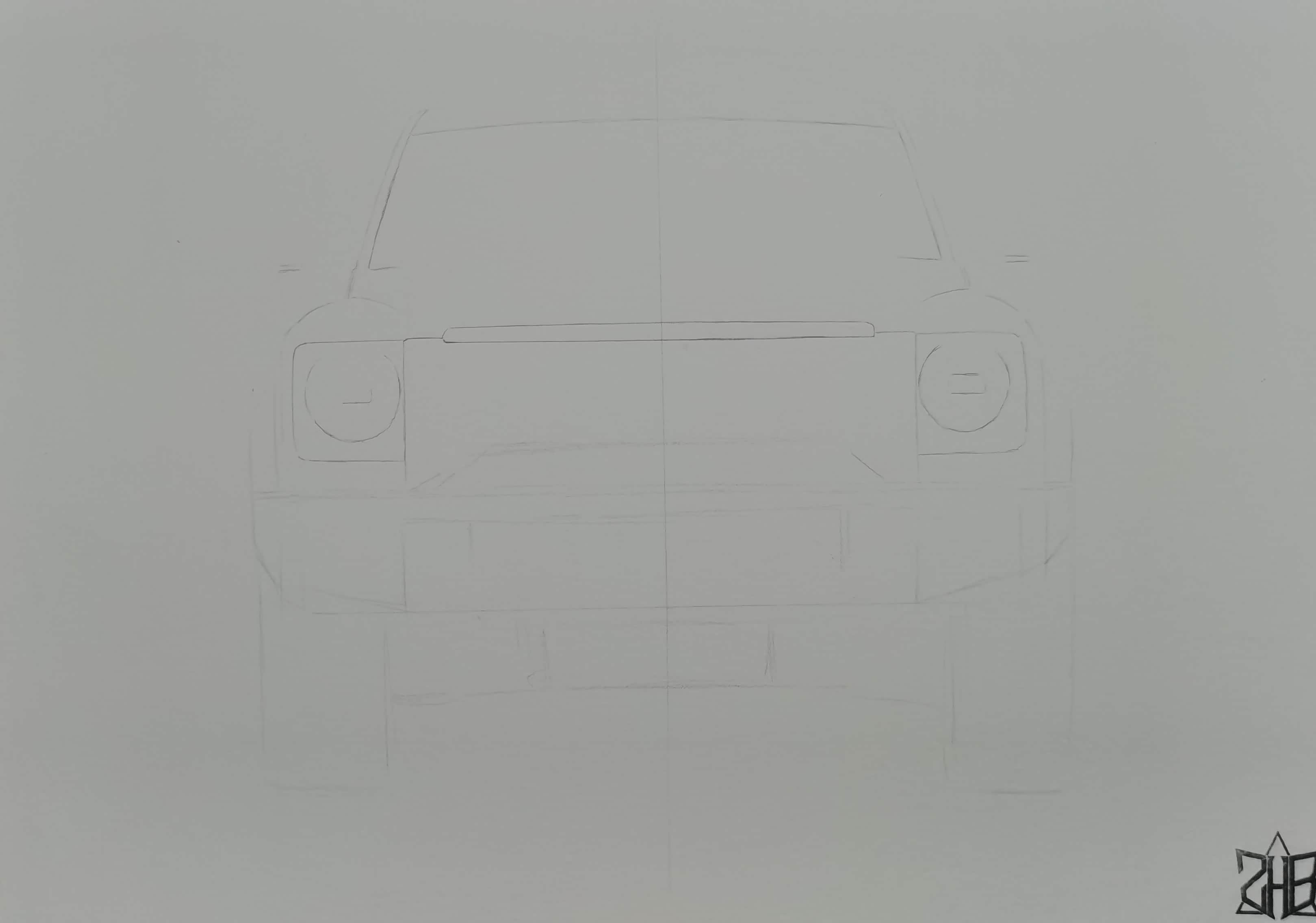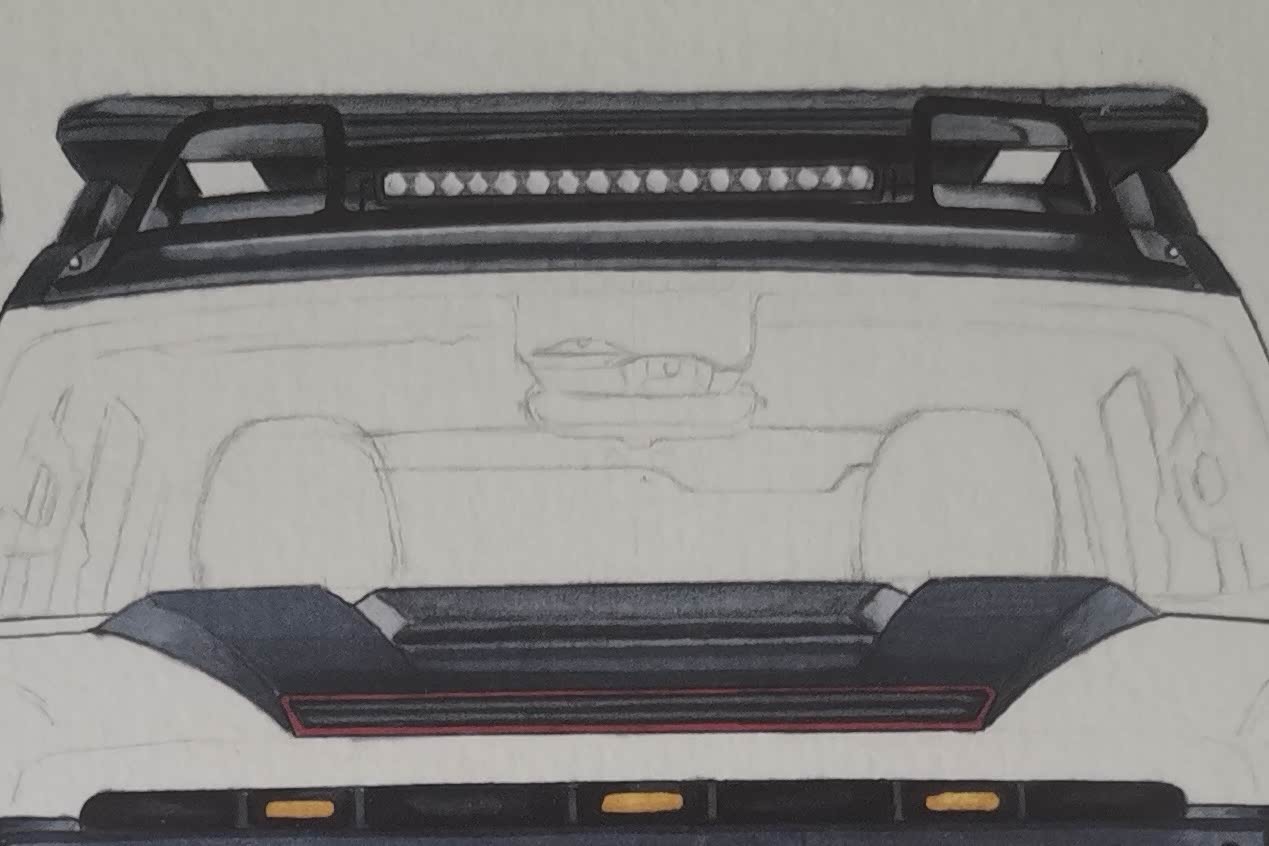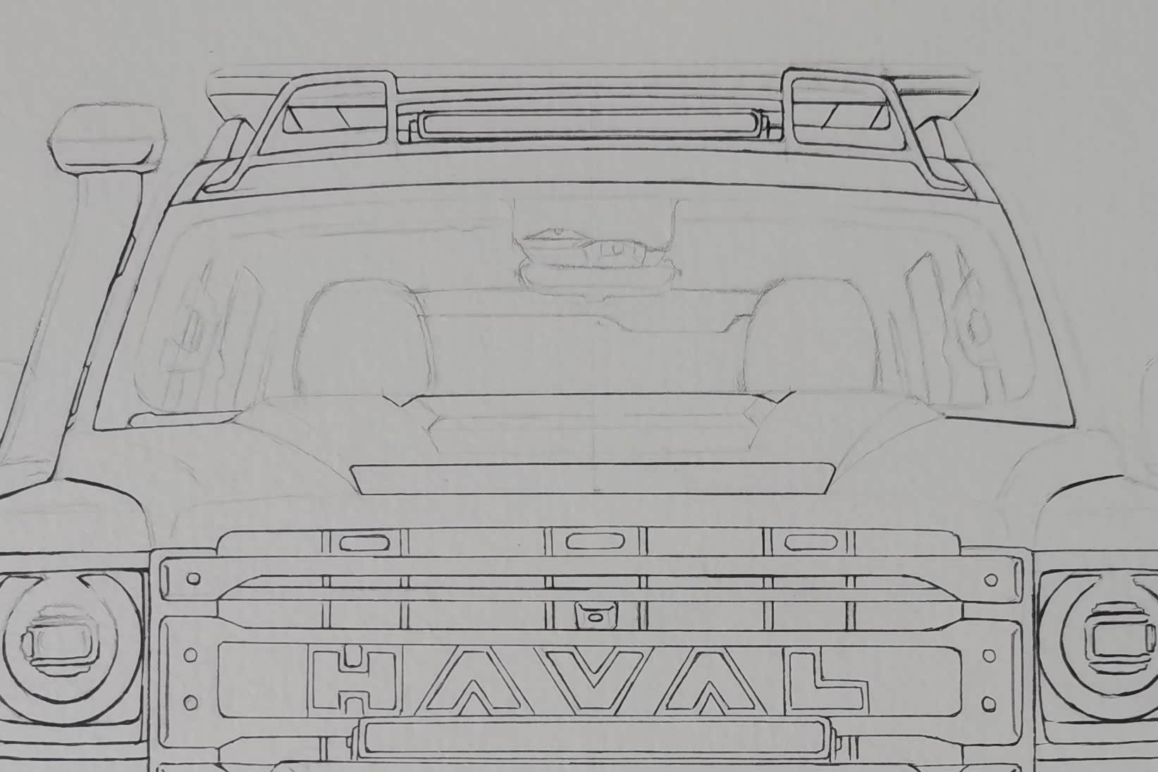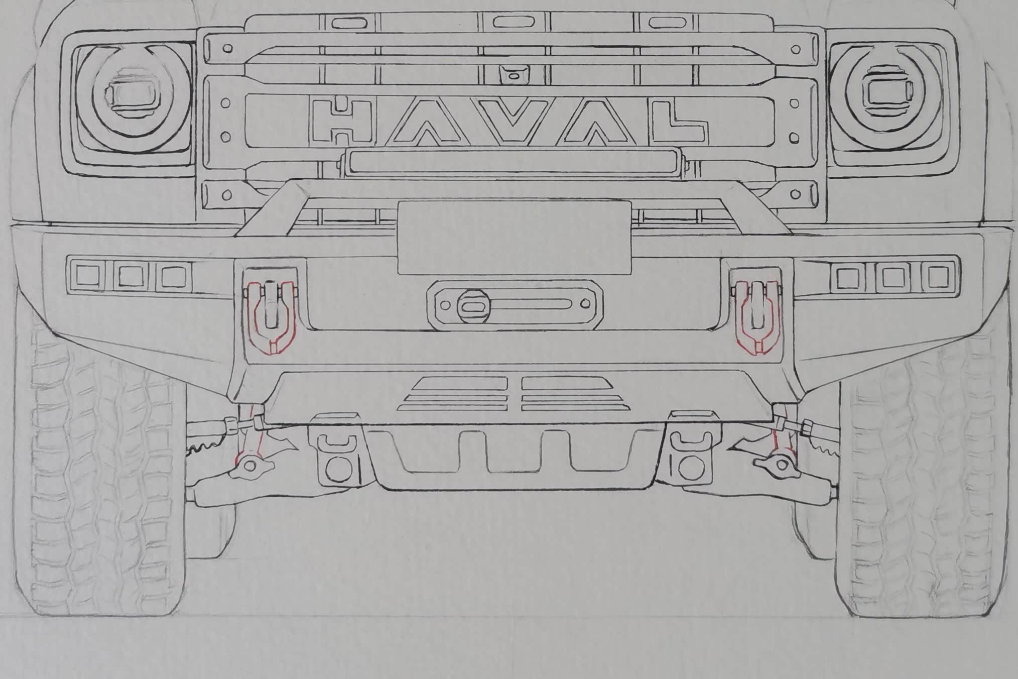 素车采用25年新上的版本,2025款2.0T汽油四驱勇士版,售价格23.99万,相比于汽油顶配车型勇士版许多配置都是标配。此次改装为车辆正面,确定好素车构图,画出车辆大致的草稿图,同时把需要改装的地方先预留出来;初步形体草稿完成后,开始加深并细化车身形体,进一步确定好车身、中网大小等形体,使得整台车初步成形。
