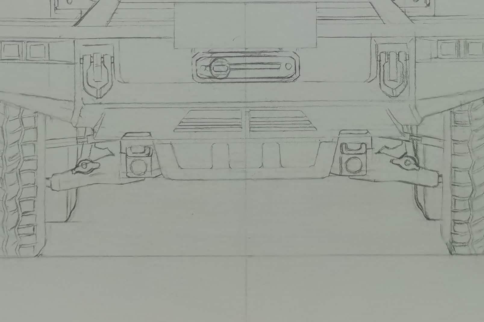 改装项目:竞技杠、内置绞盘、机盖通风装饰、AT3轮胎、升高避震、涉水喉、车顶平台和照明灯。确定改装项目,就开始画细稿,把所有改装项目的细节都画好。