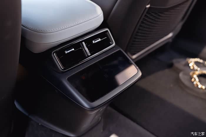 到第二排感受下,座椅坐上去还是蛮舒服的,而且靠背可以调节,还有加热功能。这里是一个5.7英寸的液晶屏,可以调整音乐以及座椅等,后排人使用起来还是很方便的。