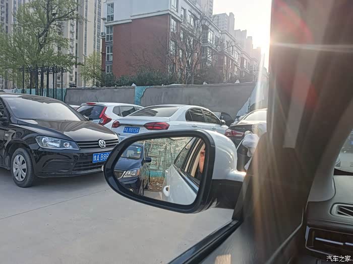 ?倒车时除了观察右侧后视镜,也要注意我们的前方是否会蹭到这一排横着停放的车子。