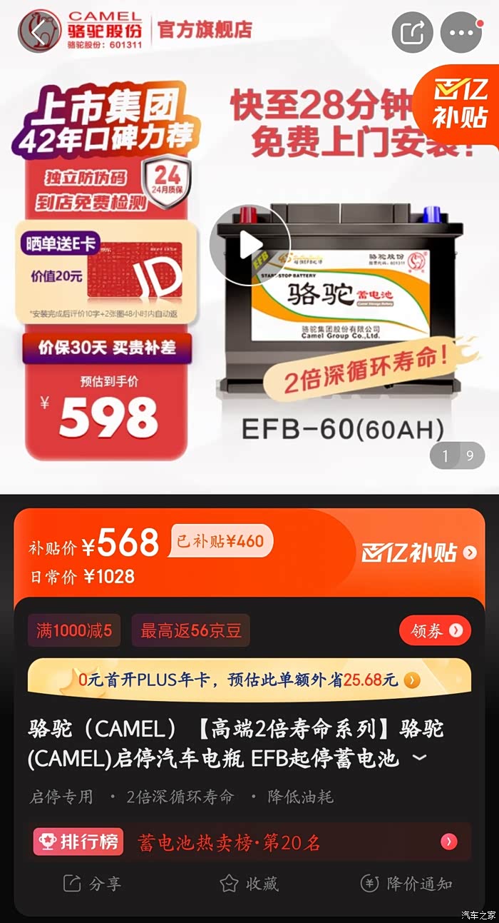 当晚就在京东上看电瓶。原装电瓶是60安的,就买的60安带自动启停的。