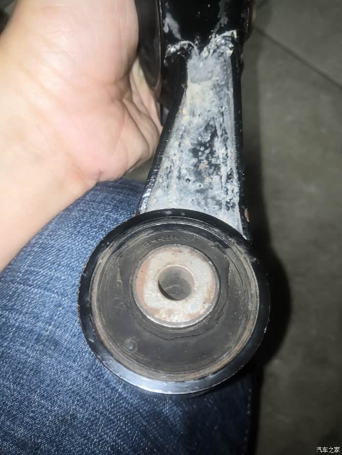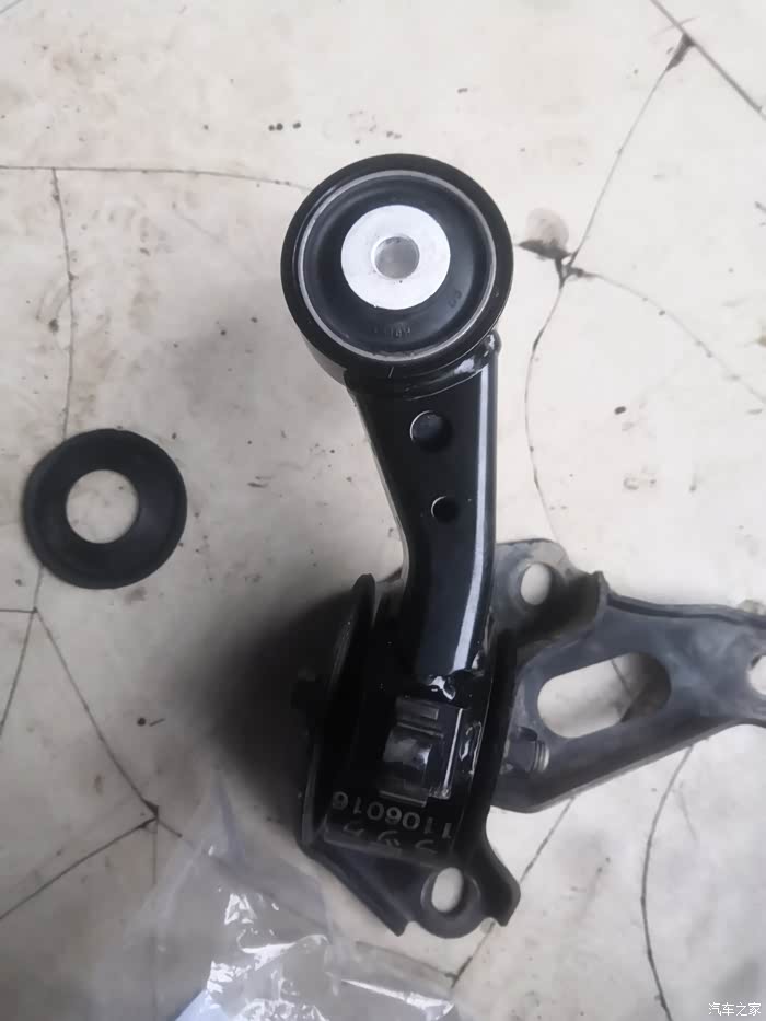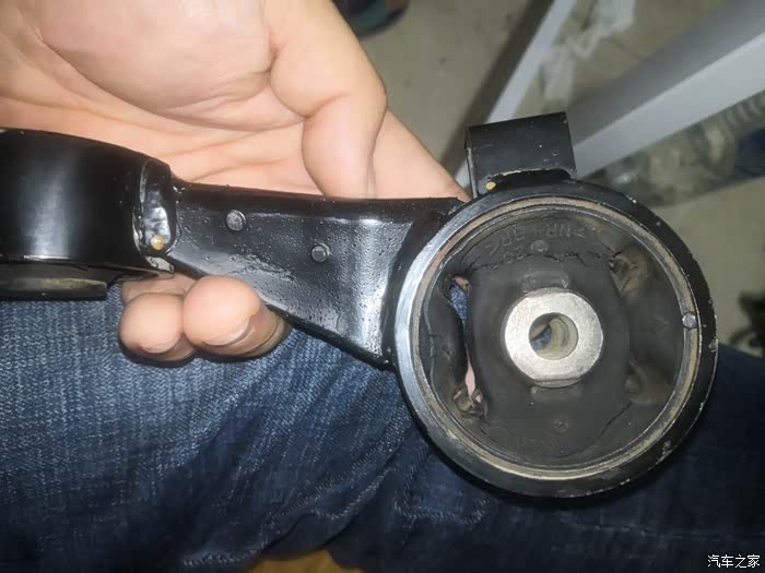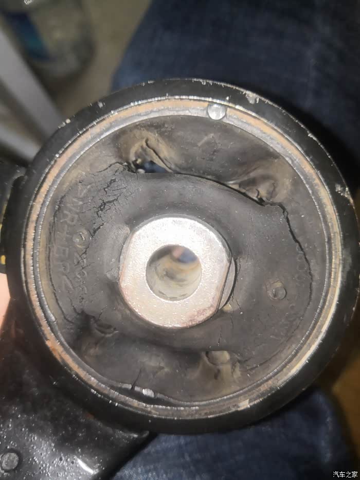这是我要更换的原厂吊杆缓冲胶,我为什么要更换他是因为我在驾驶车辆时发现换档时车子总会有轻微的顿挫感,后来检查时发现旧的吊杆缓冲胶已经开裂了。而这也是我车子换档时有顿挫感的原因。