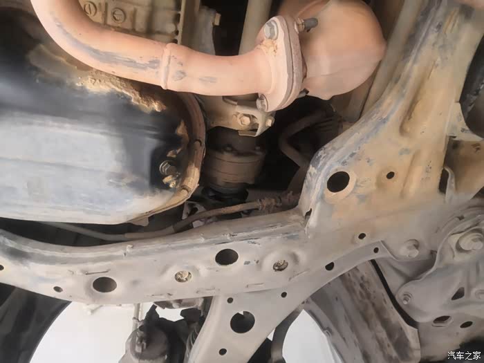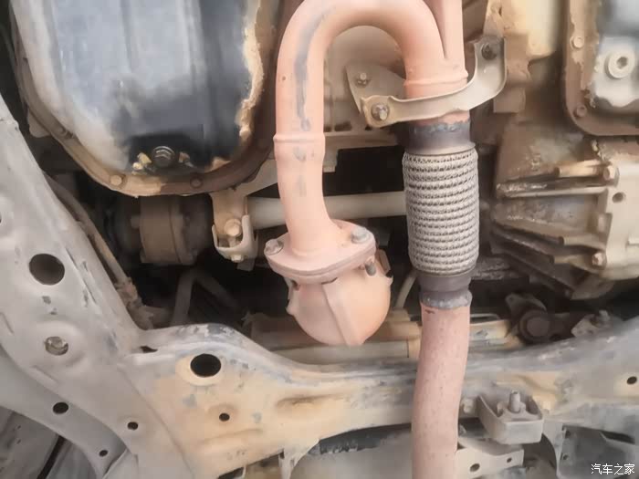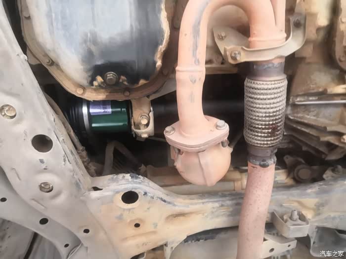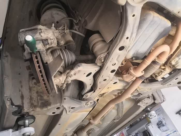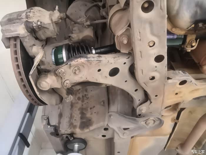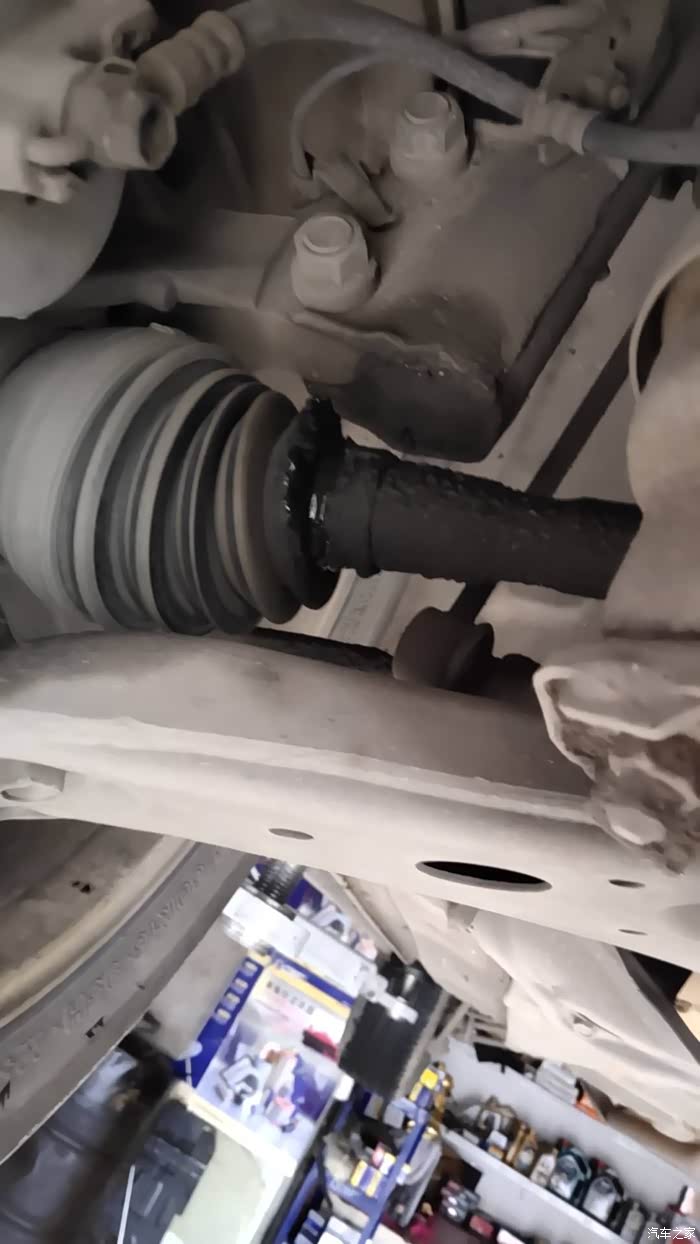 这是更换好了的全新右前半轴总成装车效果。更换完了以后向右转弯,再也没有异响了,而且开起来更顺了