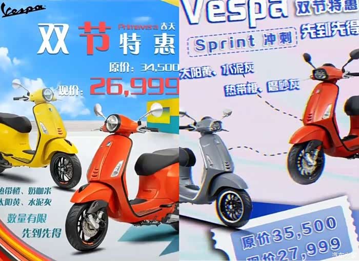 经过降价后Primavera S售价来到了26,999元,Sprint S售价来到了27,999元。不过优惠的车型有指定配色,Primavera S为热带橙、奶咖米、太阳黄、水泥灰;Sprint S为太阳黄、水泥灰、热带橙、磨砂灰,并且表示数量有限,先到先得。