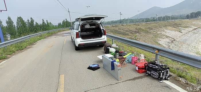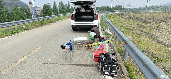 支好天幕以后就是开始卸我的钓鱼装备了,给大家看看我的装备有多少,这个时候就知道选一个空间够大的车有多重要了吧。我这辆哈弗H5后排座椅放到以后,后备箱空间有差不多两米,所以完全可以放下我所有的露营装备。