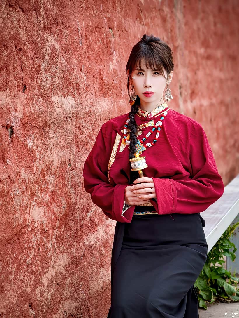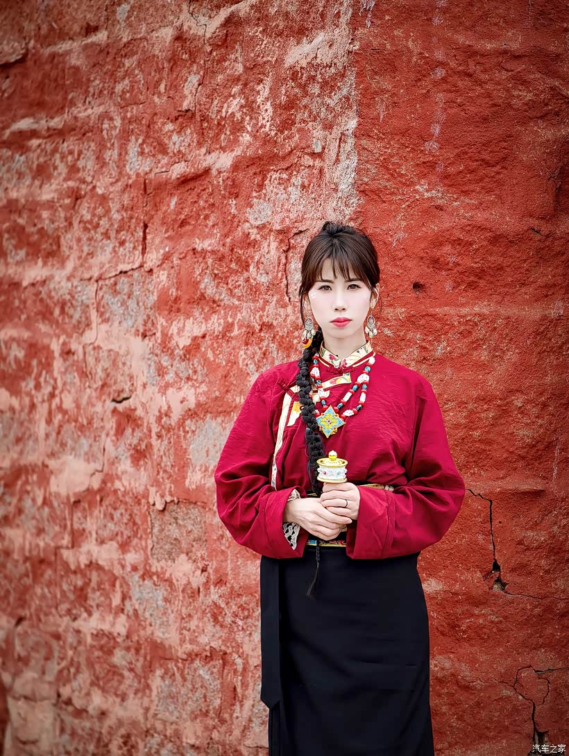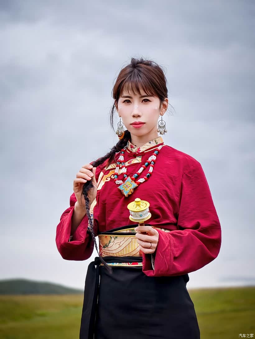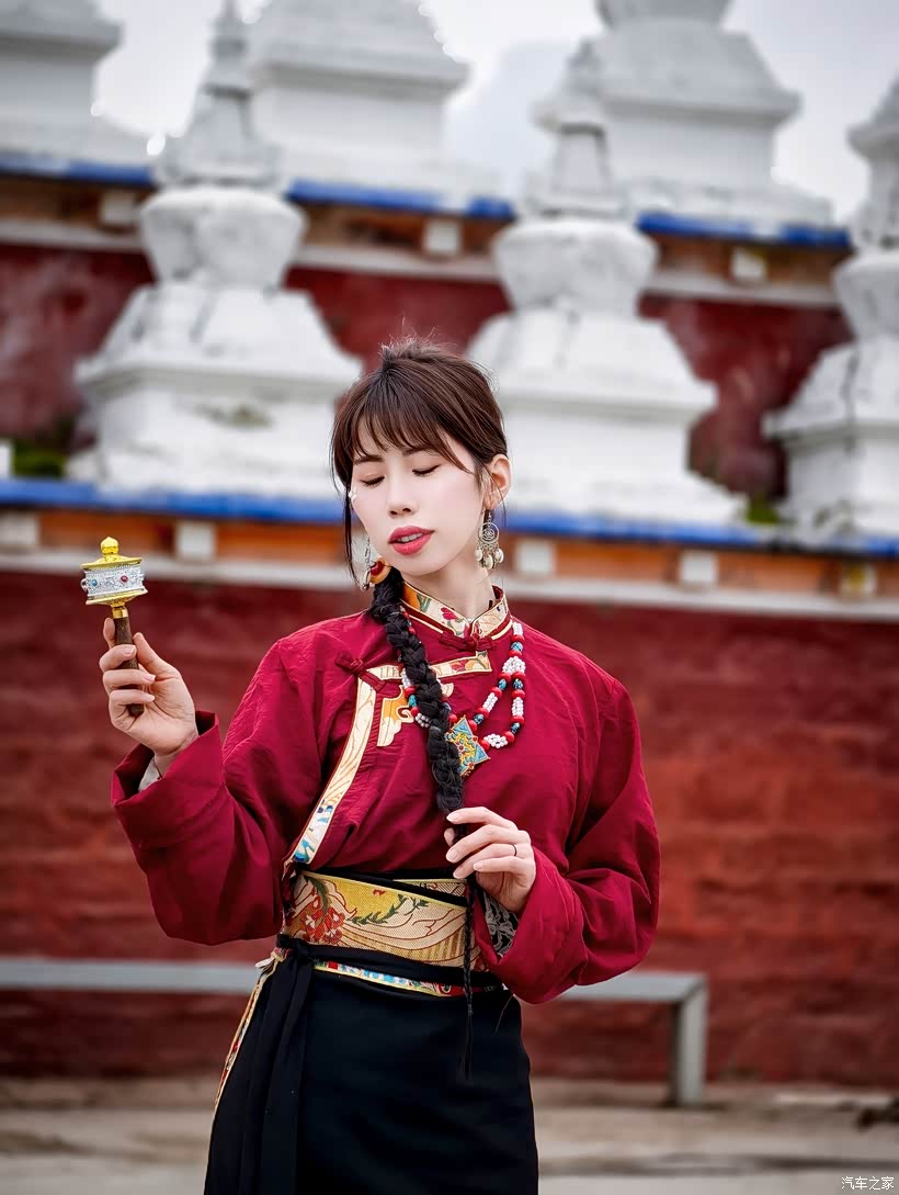 她拉着我们冲进去,一眼就看中了一套红上衣黑长裙的藏装,非要让店员给她打扮成“草原卓玛”。店员麻利地给她穿上藏装,戴上羽毛头饰,化了个淡妆。当老婆从试衣间走出来时,别说,还真有那味儿——红色藏装衬得她皮肤雪白,眉眼间带着几分娇羞,活脱脱一个从草原深处走来的卓玛。
