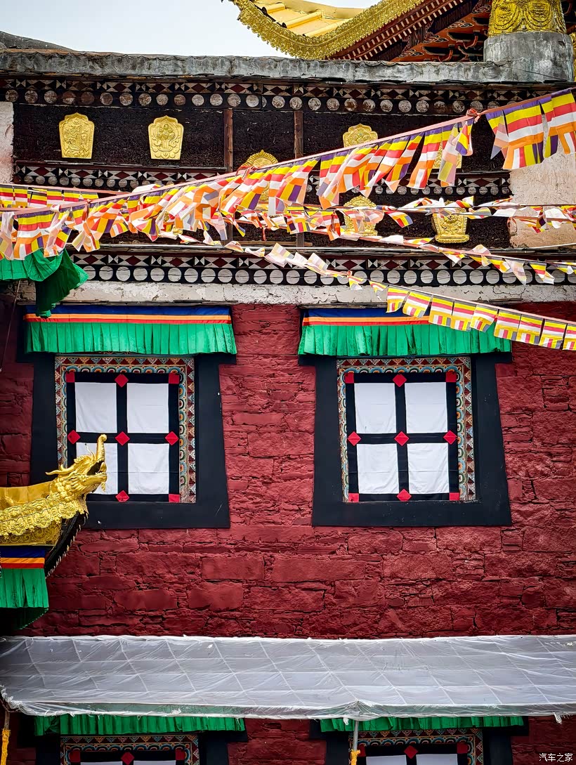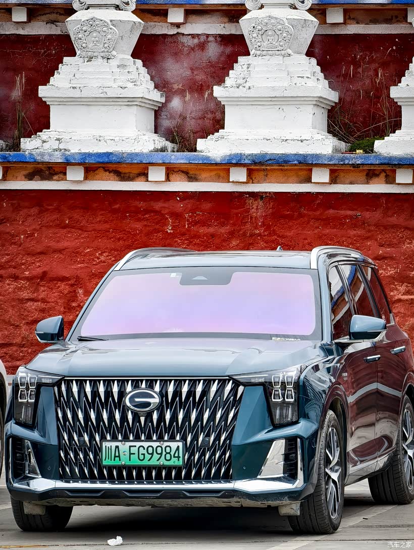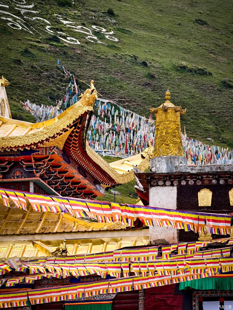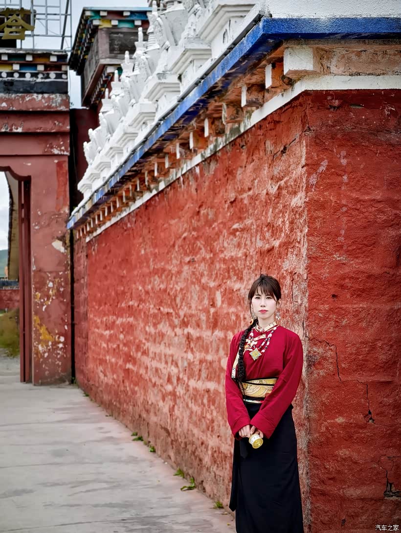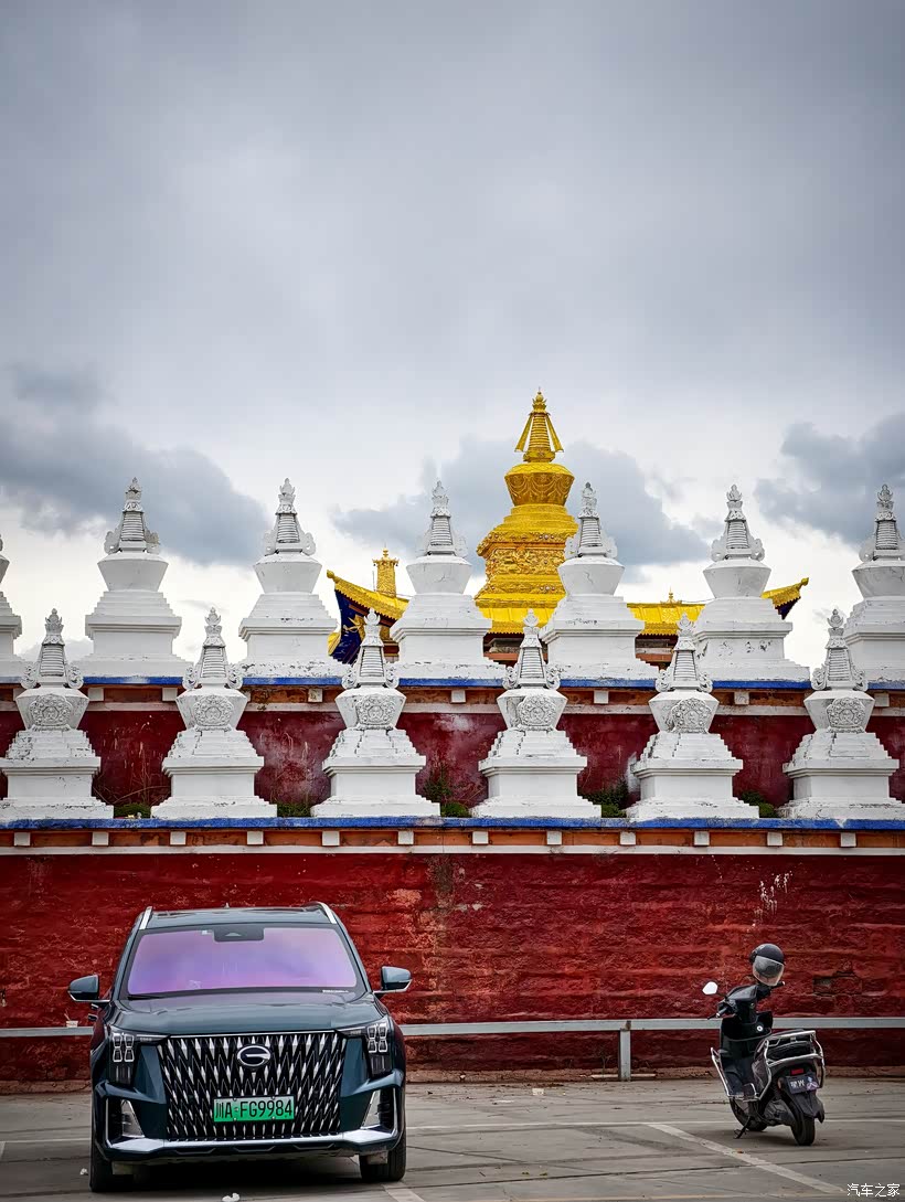 离开斯丁措,我们前往塔公寺。这座千年古寺庄严肃穆,红墙金顶,气势恢宏。老婆拉着我们在红墙前合影,还特意让斌斌把传祺ES9开过来,说要“让车也沾沾灵气”。