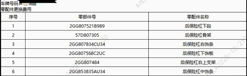 1. 后保险杠:因未破裂,选择修复后喷漆。