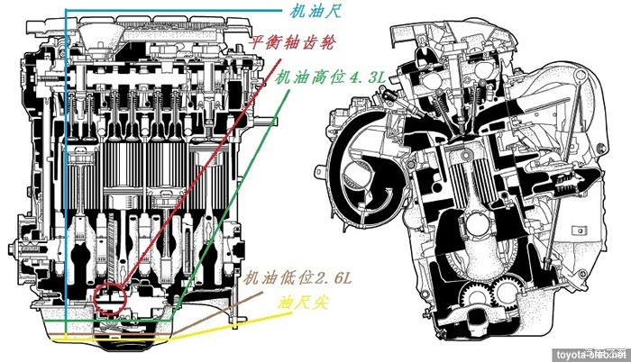 发动机机油尺通常有上下刻度,也就是高位和低位,有的厂家会在说明书上介绍高低之间的机油容量,丰田的5GR(2.5)和3GR(3.0)发动机油尺的高低位间容量为1.5升,8AR-2.0T发动机油尺的高低位间容量是1.7升,机油容量(排空后加注)分别: