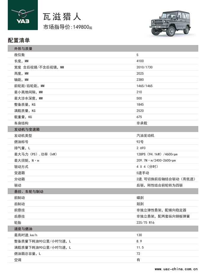 发动机搭载的是2.7L汽油机,最大功率94.1kW(128Ps)/4600rpm,最大扭矩209.7Nm/2500rpm。整备质量1.85吨,等速90km/h的百公里油耗为8.9L,满载情况下油耗是11.5L.最高时速130km/h。
