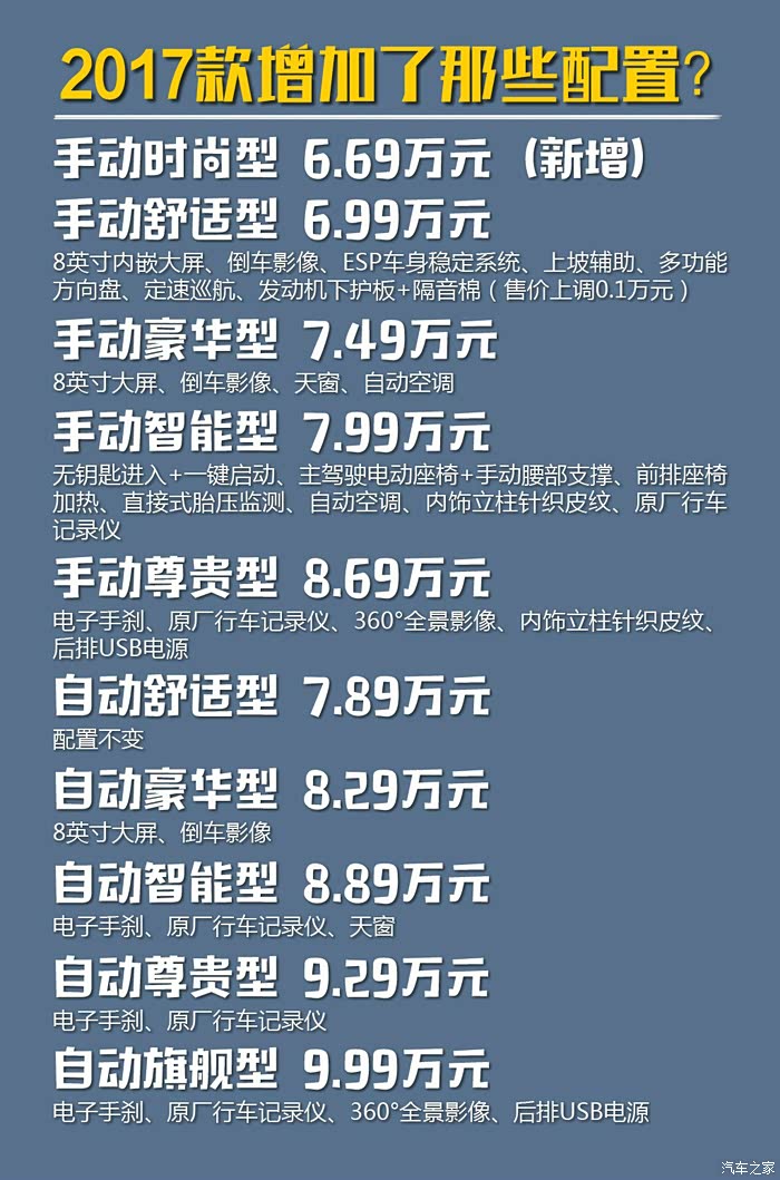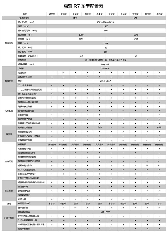 作为年度改款车型,2017款森雅R7把主要精力放在了提升配置上,造型设计和机械规格则没有发生变化。期待已久的1.5T车型并未同期推出,预计到9月份才能与人们见面。不过,仅增配这项动作就足以带来不小的新意,尤其是手动挡车型。
