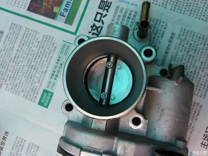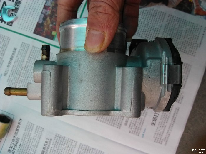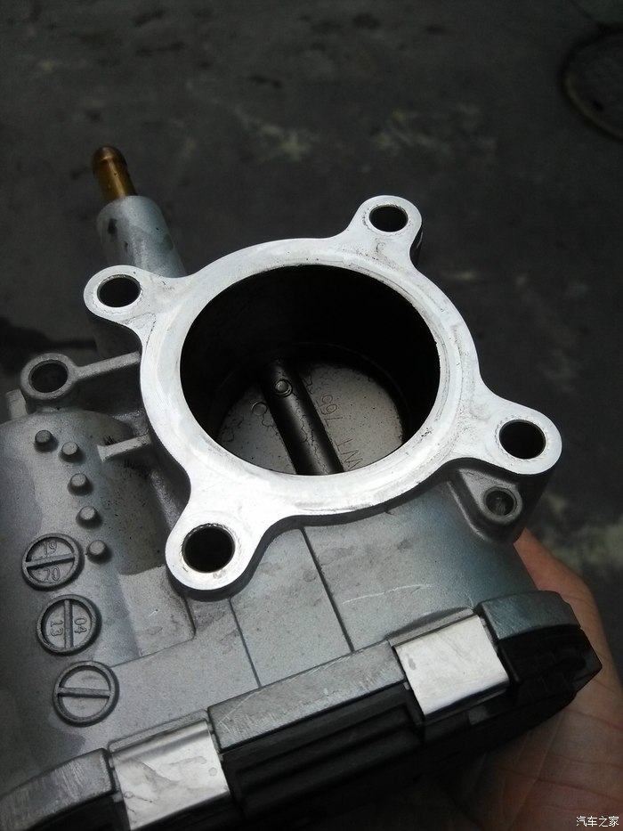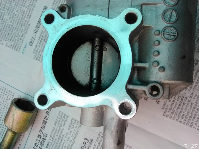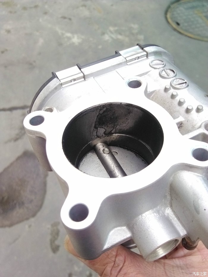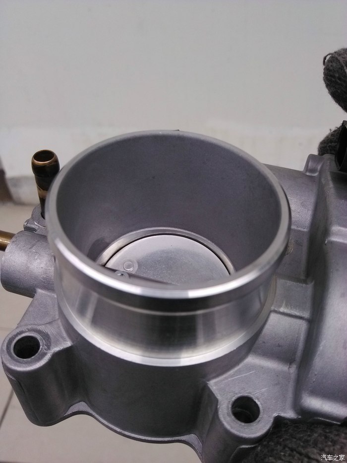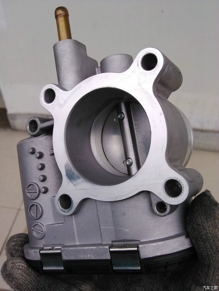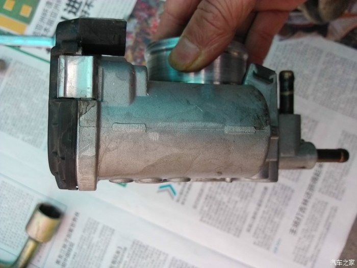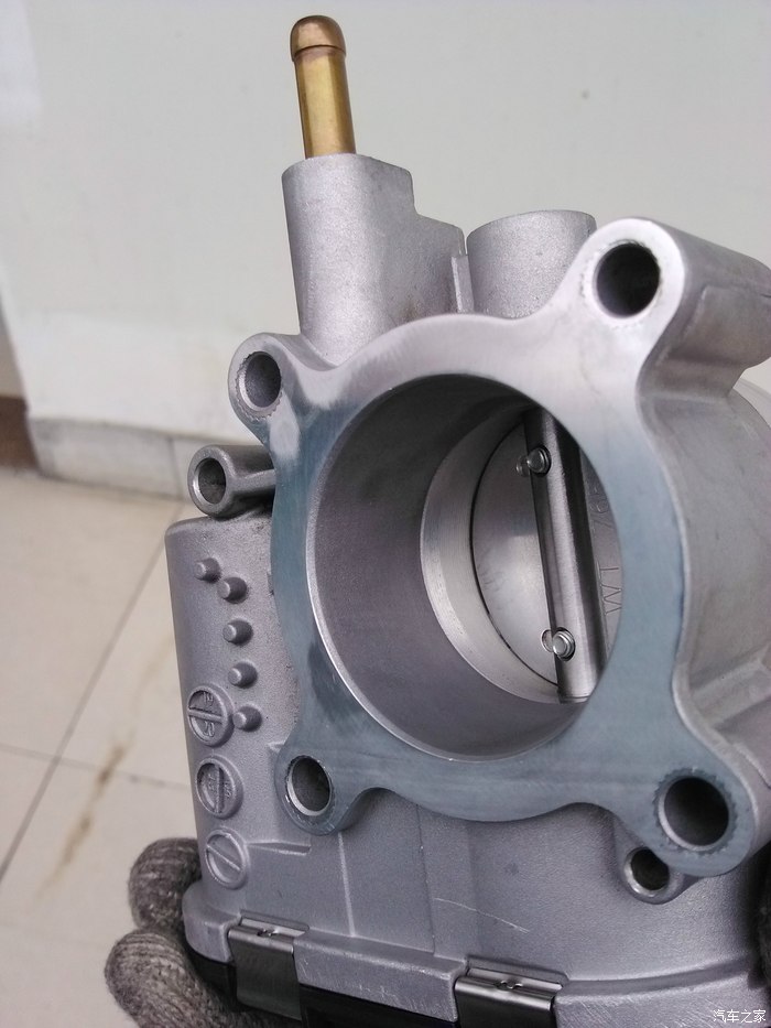 看到下面那个白色的就是电子节气门了,4个螺钉卸掉,很容易就把节气门拿下来。节气门够脏了,就这样是安全行驶5万公里的节气门了。