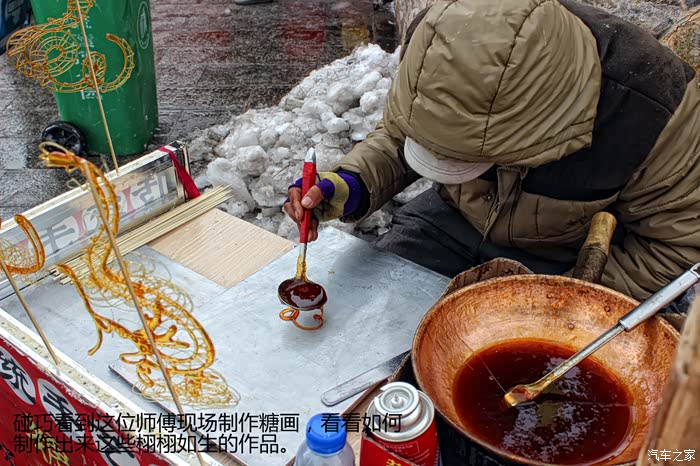 吹糖人的老艺人,今天的低温让老大爷冻得够呛,不过要做吹糖人也不能戴手套,确实也是蛮辛苦的。