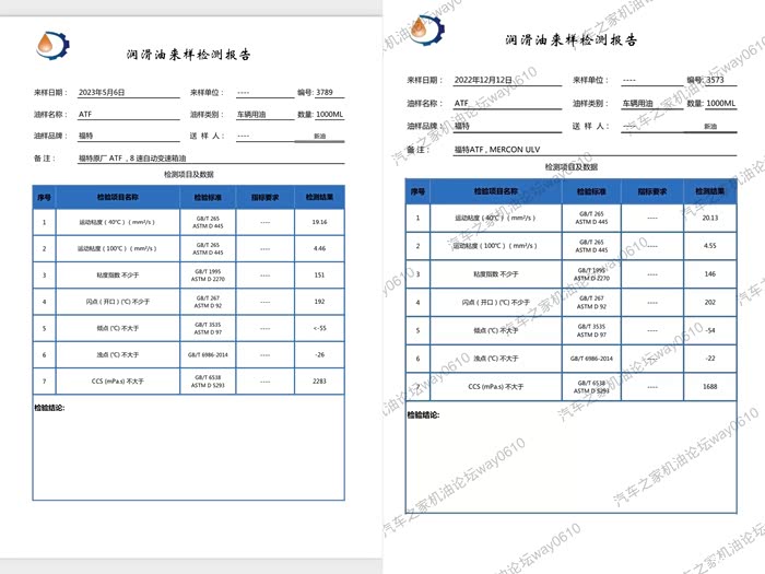 几个月前way测试了进口版福特猛禽10速红桶,指标非常强悍,基础油很棒,估计用了四类油,那么很好奇4s福特锐际版蓝桶变速箱油指标如何?抱着研究的态度,我特意从某宝热门店买了一桶锐际专用,送去检测,对比结果见图。