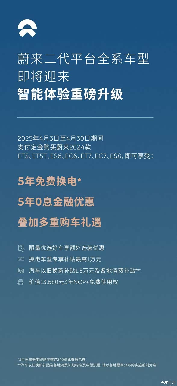 4月的蔚来购车政策可以说是超级无敌香,以至于各个车友群都炸锅了!不仅有5年免费换电,还叠加了5年0息金融方案,再加上各种选装基金和补贴,直接让购车门槛降到了低点!