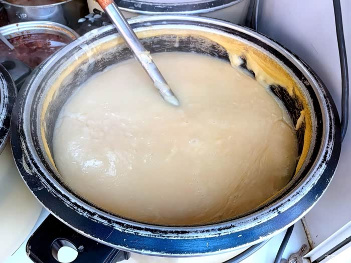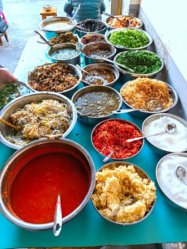 普洱市的豆浆米干是当地名小吃,香浓的豆汁浇到烫热的米干上,十几种佐料选自己喜欢的随意舀取,高櫈当桌,街边就坐,晞晞嗦嗦就吃了个呼儿嗨哟。每天清晨,各早点铺的门前,都是这一道风景。