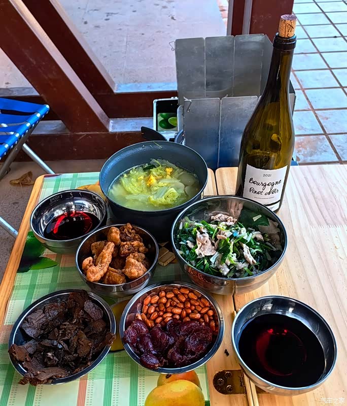 车停事先找好的窝窝喷泉广场,24小时收费15元。广场上风大,在一背风吸烟亭里做我们的年夜饭,六个菜,够了,老夫妻俩举碗共饮美酒,酒逢知己。