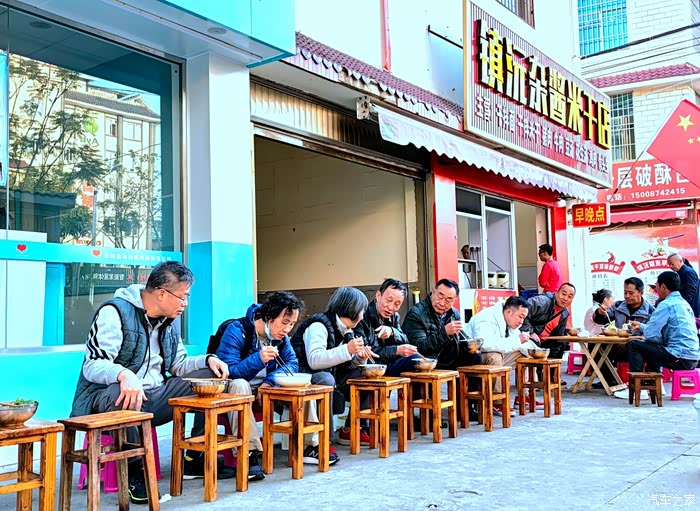 国道旁居然有个小驿站,叫草皮坝车站,有休息室、卫生间及长廊和一大块场地,几个妇女在卖凉粉米线小零食,我们行车时就做好了午饭,摆起小桌就开吃。