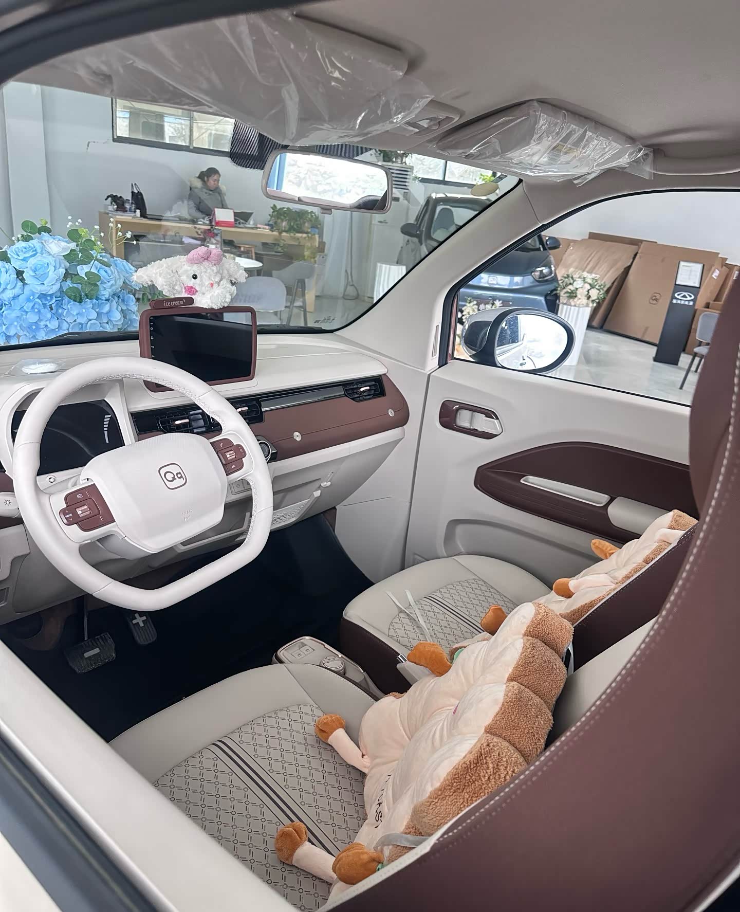 它不廉价,这个配色棕色➕米色看上去很有质感,方向盘是那种仿皮的,摸上去质感也挺好,中控台是那种类似麂皮的材质,类绒布材质的座椅带有菱形格纹路与专属刺绣,触感柔软舒适,久坐也不会觉得累。